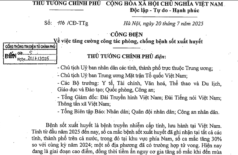 Trước diễn biến phức tạp của dịch sốt xuất huyết (SXH) trên cả nước, Thủ tướng Chính phủ đã ban hành Công điện số 116/CĐ-TTg ngày 20/7/2025 về tăng cường công tác phòng chống bệnh sốt xuất huyết, chỉ đạo các bộ, ngành và...