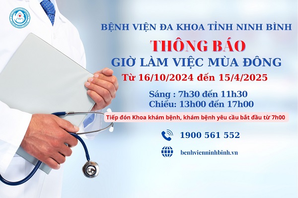 Từ ngày 16/10/2024, Bệnh viện Đa khoa tỉnh Ninh Bình bắt đầu thực hiện giờ làm việc mùa đông theo quy định chung của các cơ quan Nhà nước.