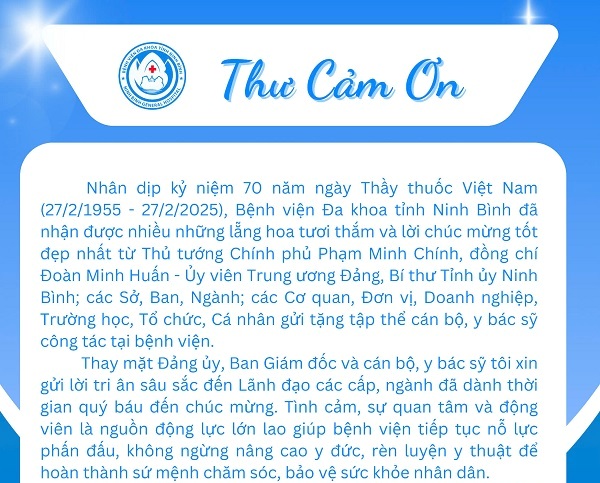 Bệnh viện Đa khoa tỉnh Ninh Bình trân trọng gửi lời cảm ơn đến Lãnh đạo các cấp; các Sở, Ban, Ngành; các Cơ quan, Đơn vị, Doanh nghiệp, Trường học, Tổ chức, Cá nhân đến thăm, chúc mừng kỷ niệm 70 năm ngày Thầy thuốc Việt...