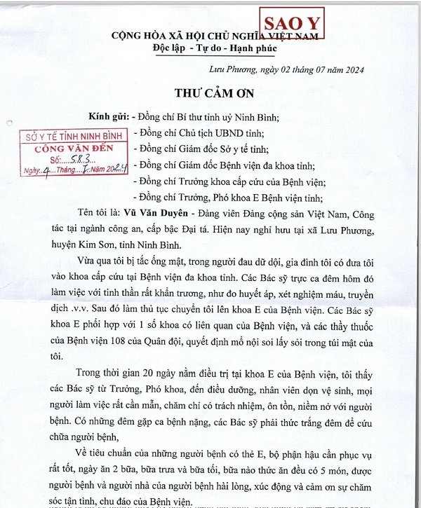 Ngày 02/7/2024, Ngành Y tế có nhận được Thư cảm ơn từ ông Vũ Văn Duyên, ở Xã Lưu Phương, huyện Kim Sơn; trong đó gửi lời cảm ơn đến lãnh đạo Bệnh viện Đa khoa tỉnh Ninh Bình, trưởng khoa Cấp cứu; trưởng, phó khoa Nội E b...