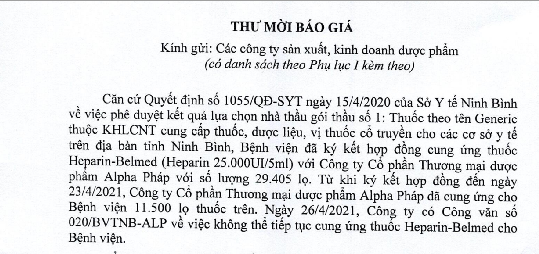 Ngày 27 tháng 4 năm 2021, Bệnh viện Đa khoa tỉnh Ninh Bình ban hành kế hoạch số: 229/BVĐK-DUOC về việc lựa chọn nhà thầu gói thầu mua thuốc Heparin 25.000UI/5ml.