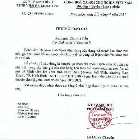 Ngày 29/4/2021, Bệnh viện Đa khoa tỉnh Ninh Bình ban hành văn bản số: 236/BVĐK-DUOC về Thư mời báo giá lựa chọn nhà thầu gói thầu mua bổ sung một số vật tư y tế sử dụng tại bệnh viện.