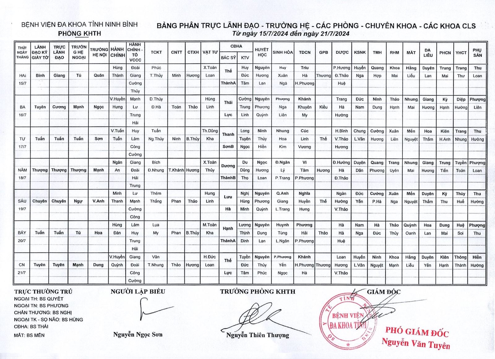 Bảng phân Lãnh đạo - Trưởng hệ - các phòng - chuyên khoa - các khoa CLS (từ ngày 15 đến ngày 21 tháng 7 năm 2024).