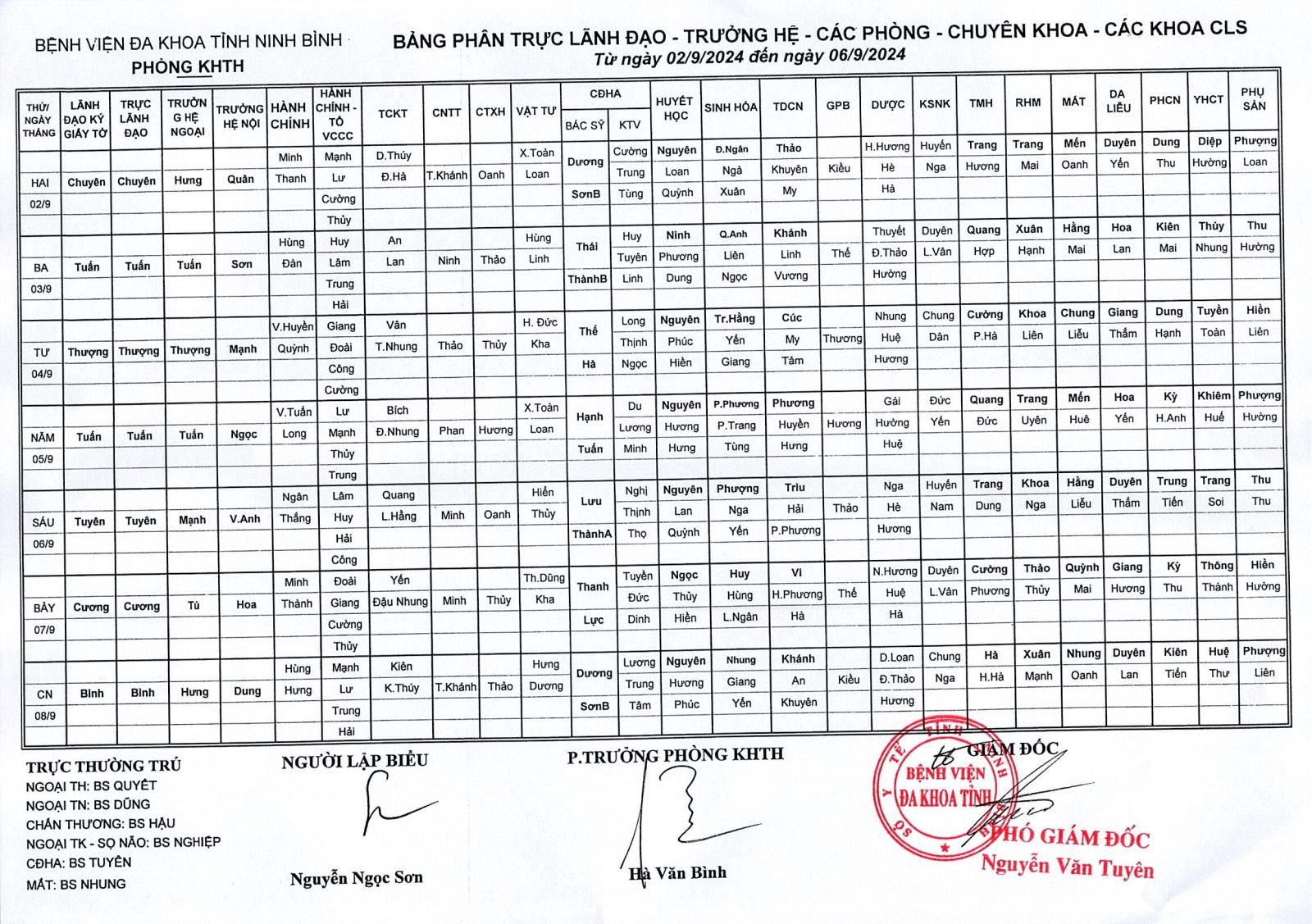 Bảng phân Lãnh đạo - Trưởng hệ - các phòng - chuyên khoa - các khoa CLS (từ ngày 2 đến ngày 8 tháng 9 năm 2024).