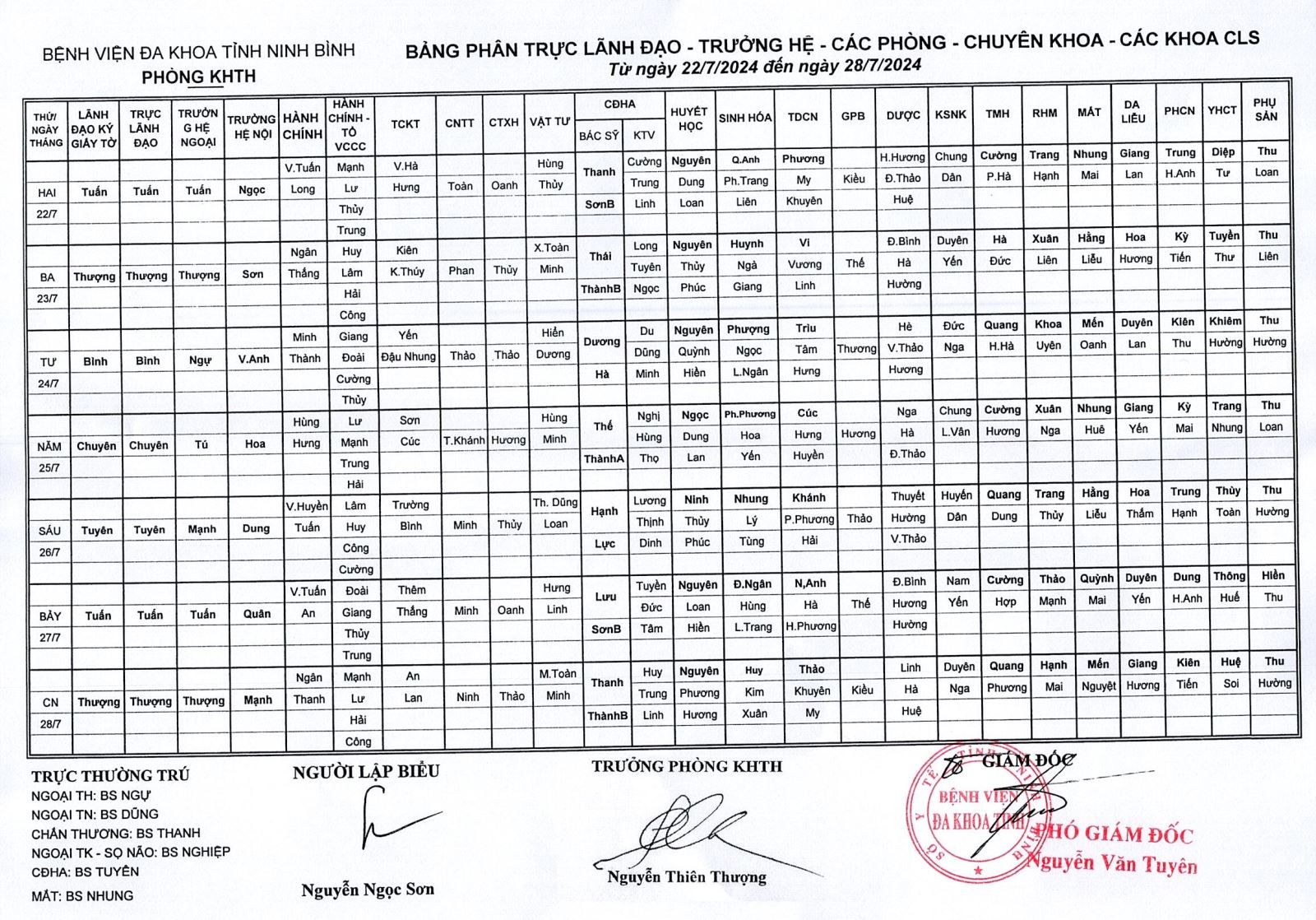 Bảng phân Lãnh đạo - Trưởng hệ - các phòng - chuyên khoa - các khoa CLS (từ ngày 22 đến ngày 28 tháng 7 năm 2024).