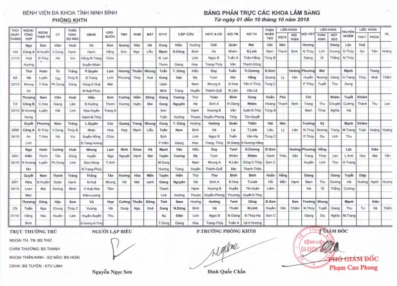 Bảng phân trực các khoa Lâm sàng (từ ngày 1 đến ngày 10 tháng 10 năm 2018)