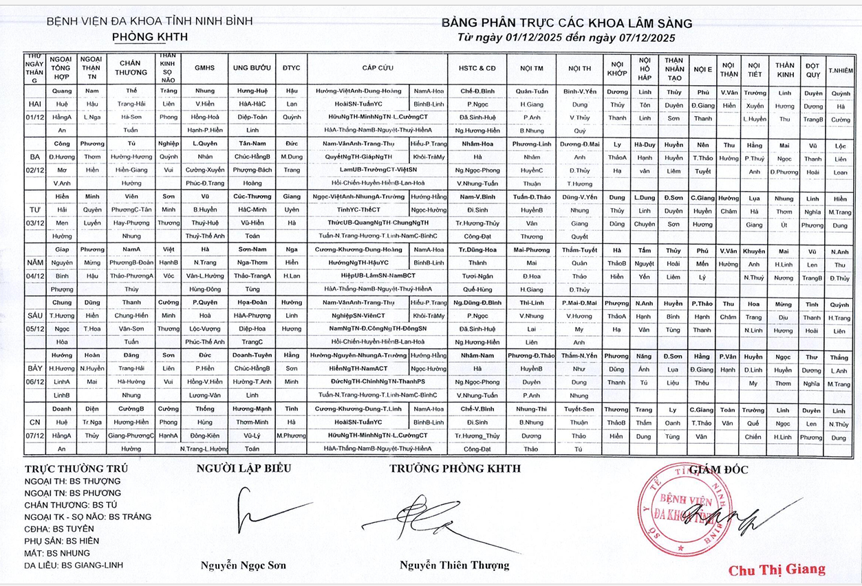 Bảng phân trực các khoa Lâm sàng (từ ngày 1 đến ngày 7 tháng 12 năm 2025).