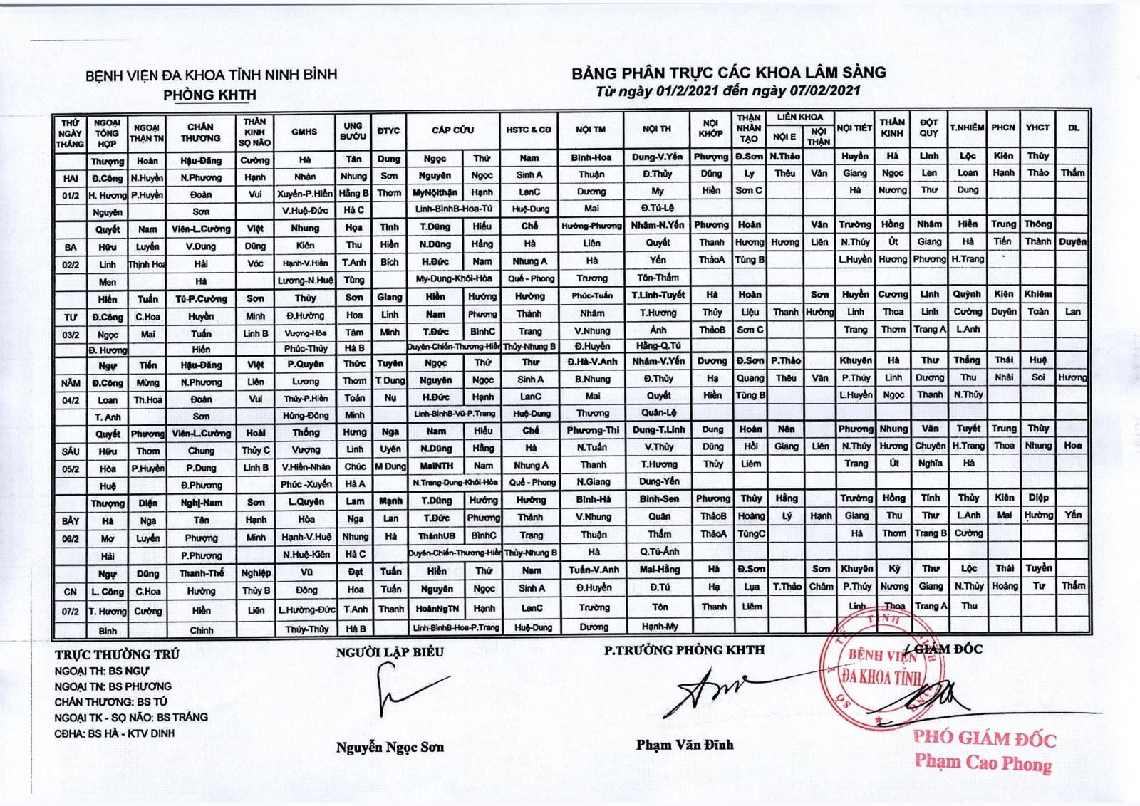 Bảng phân trực các khoa Lâm sàng (từ ngày 1 đến ngày 7 tháng 2 năm 2021)