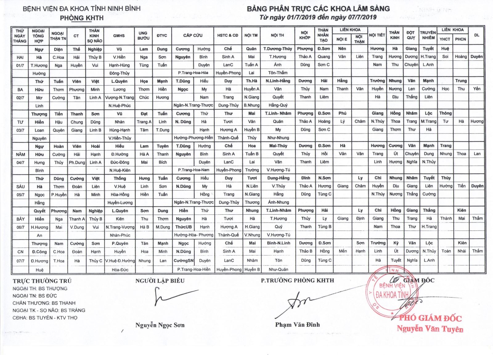 Bảng phân trực các khoa Lâm sàng (từ ngày 1 đến ngày 7 tháng 7 năm 2019)
