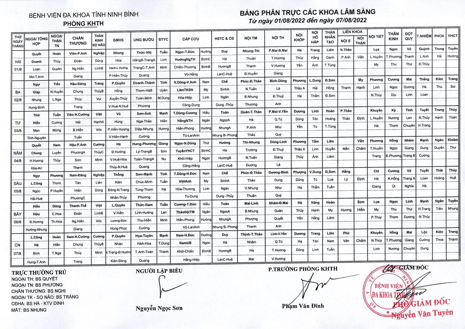 Bảng phân trực các khoa Lâm sàng (từ ngày 1 đến ngày 7 tháng 8 năm 2022).