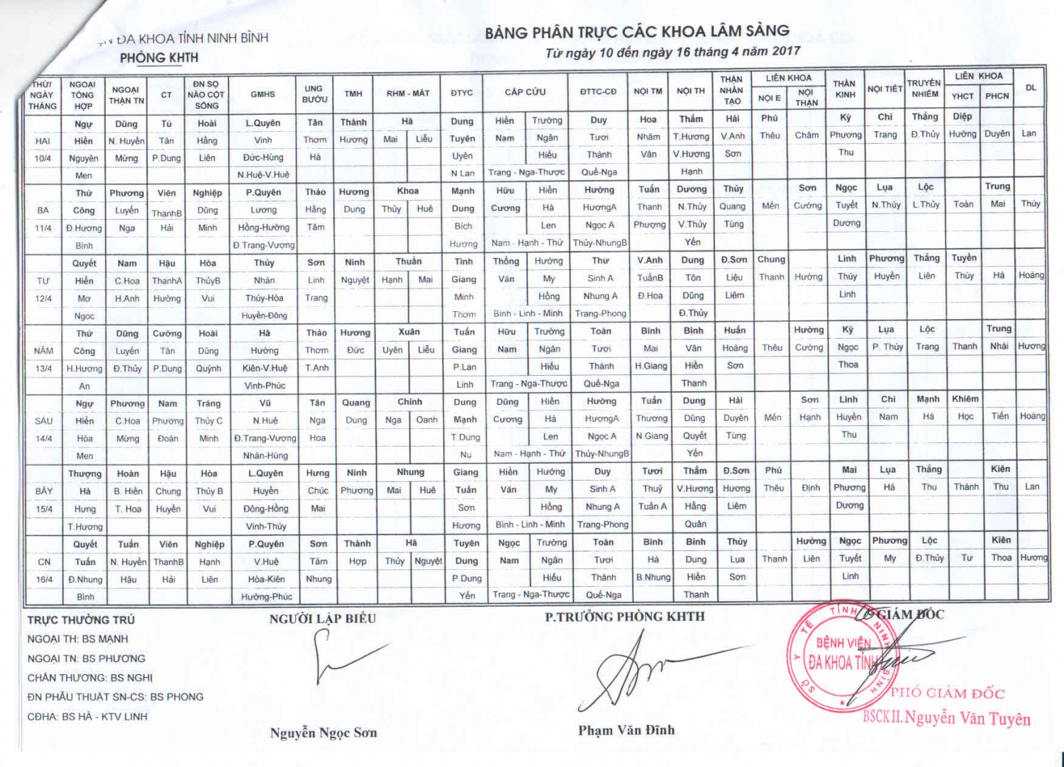 Bảng phan trực các khoa Lâm sàng (từ ngày 10 đến ngày 16 tháng 4 năm 2017)