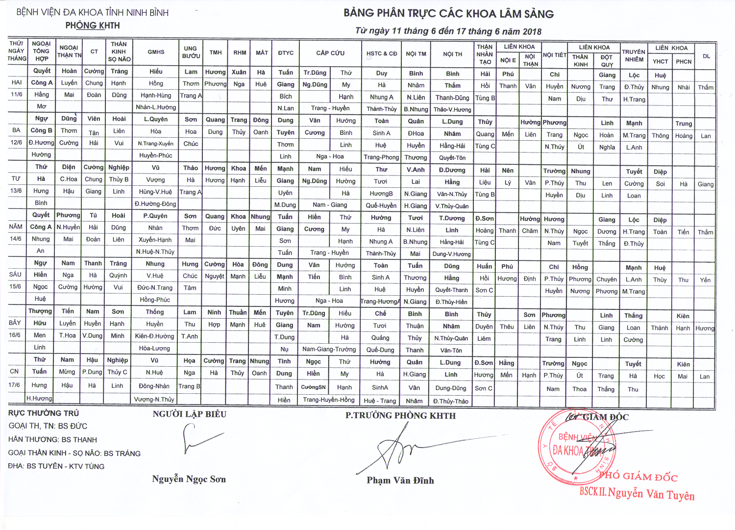 Bảng phân trực các khoa Lâm sàng (từ ngày 11 đến ngày 17 tháng 6 năm 2018)