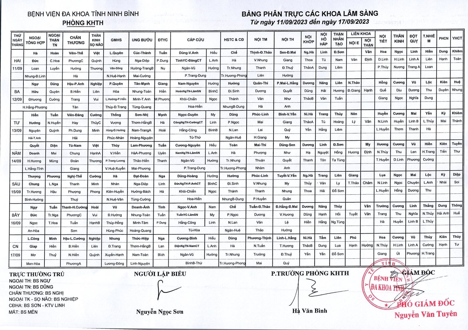 Bảng phân trực các khoa Lâm sàng (từ ngày 11 đến ngày 17 tháng 9 năm 2023).