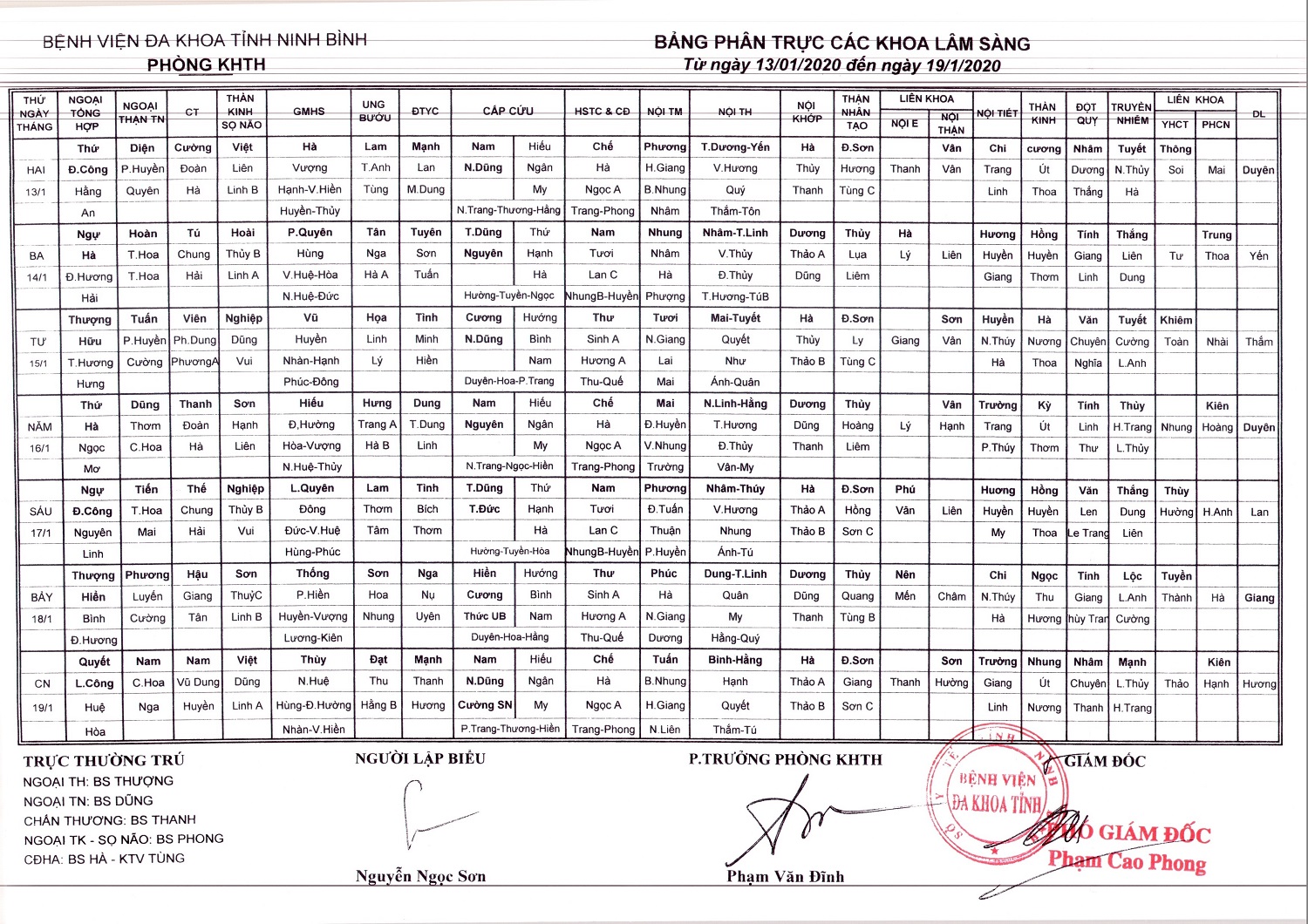 Bảng phân trực các khoa Lâm sàng (từ ngày 13 đến ngày 19 tháng 1 năm 2020)