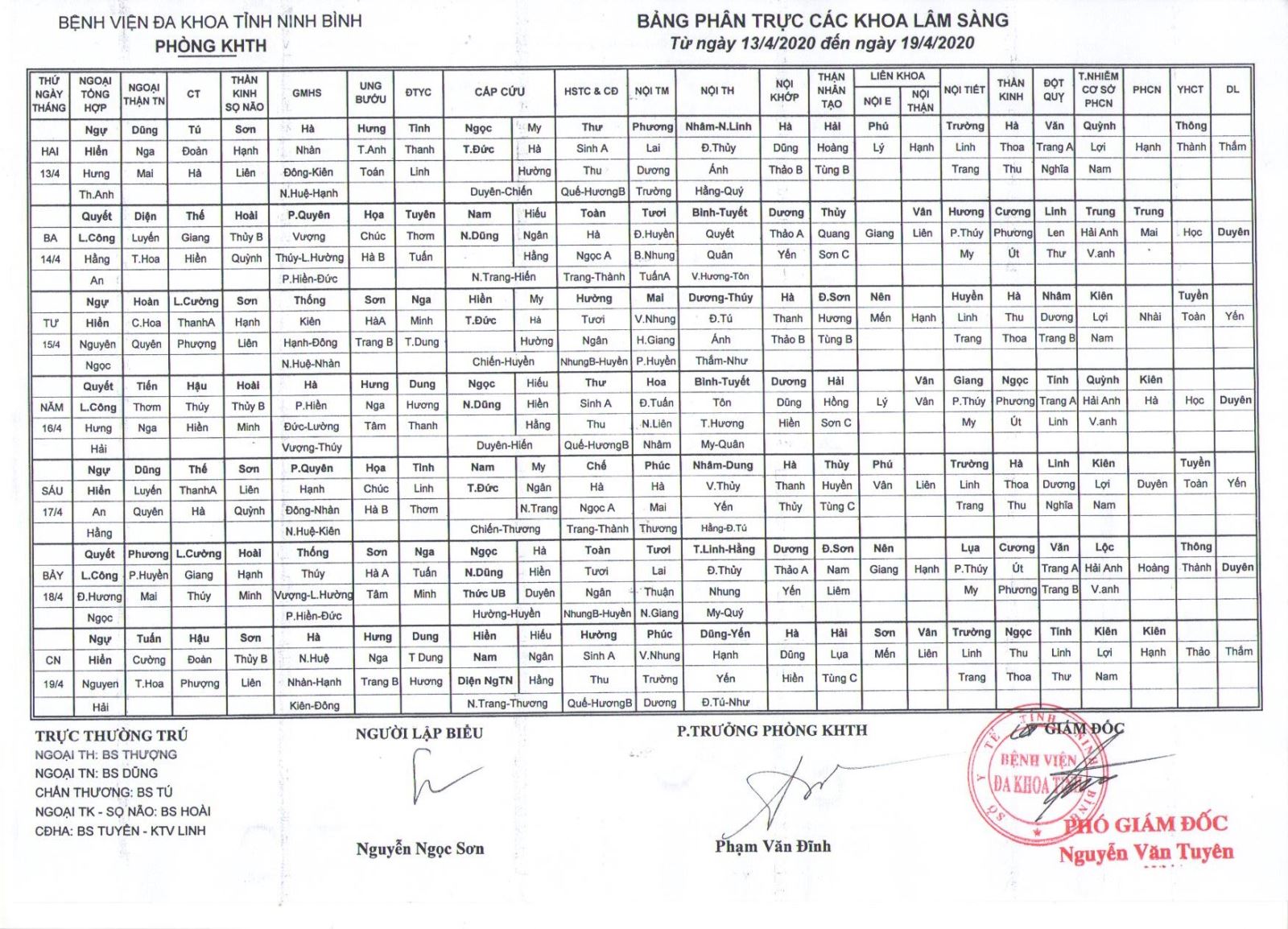 Bảng phân trực các khoa Lâm sàng (từ ngày 13 đến ngày 19 tháng 4 năm 2020)
