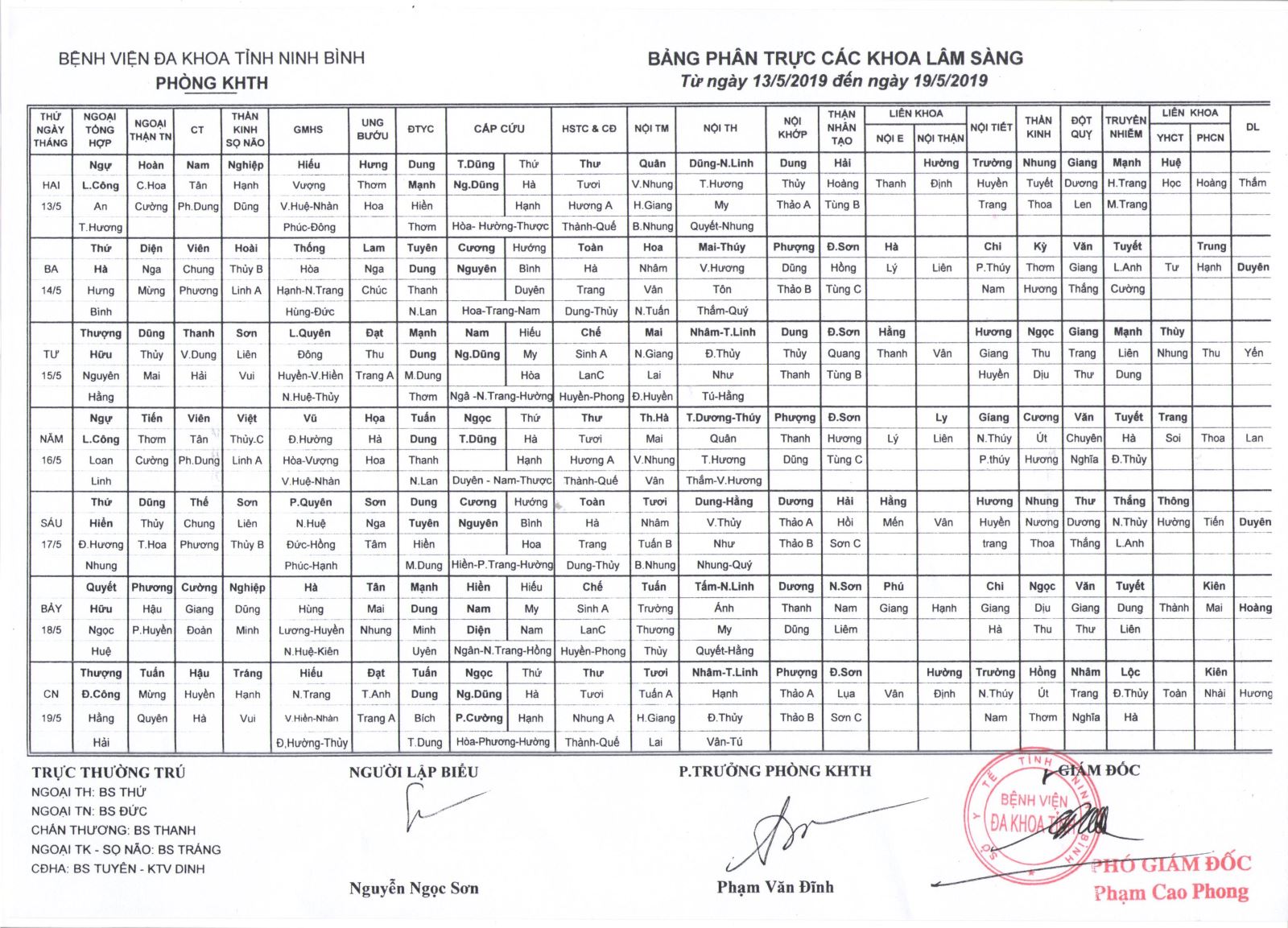 Bảng phân trực các khoa Lâm sàng (từ ngày 13 đến ngày 19 tháng 5 năm 2019)
