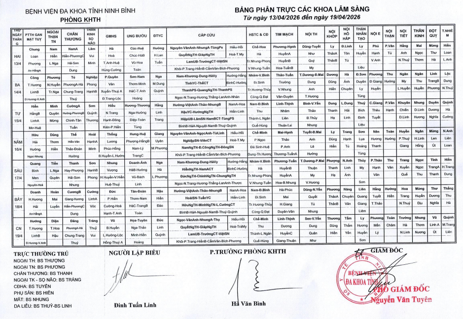 Bảng phân trực các khoa Lâm sàng (từ ngày 13 đếnn ngày 19 tháng 4 năm 2026).