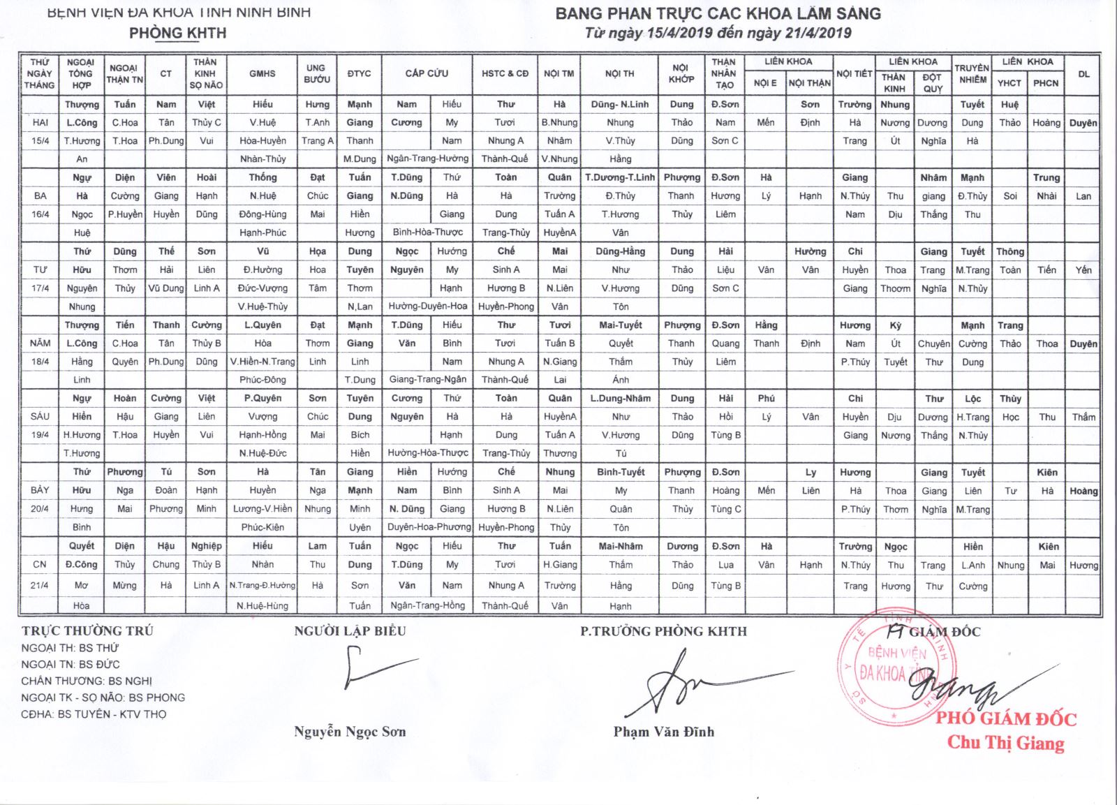 Bảng phân trực các khoa Lâm sàng (từ ngày 15 đến ngày 21 tháng 4 năm 2019)