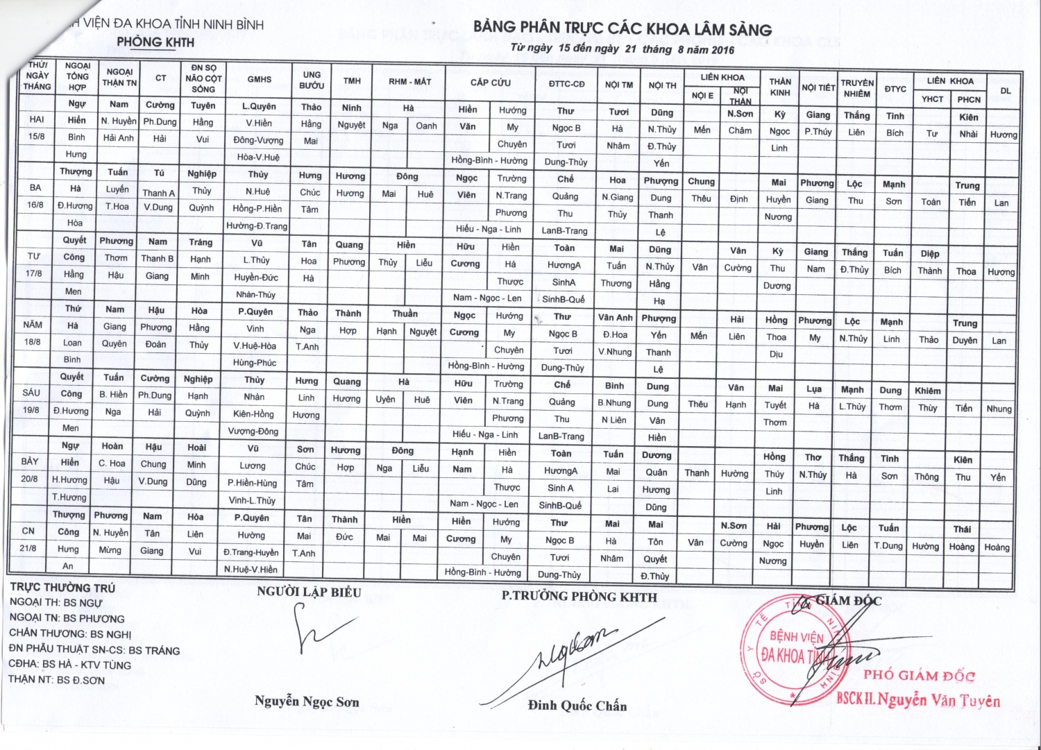 Bảng phân trực các khoa Lâm sàng (từ ngày 15 đến ngày 21 tháng 8 năm 2016)