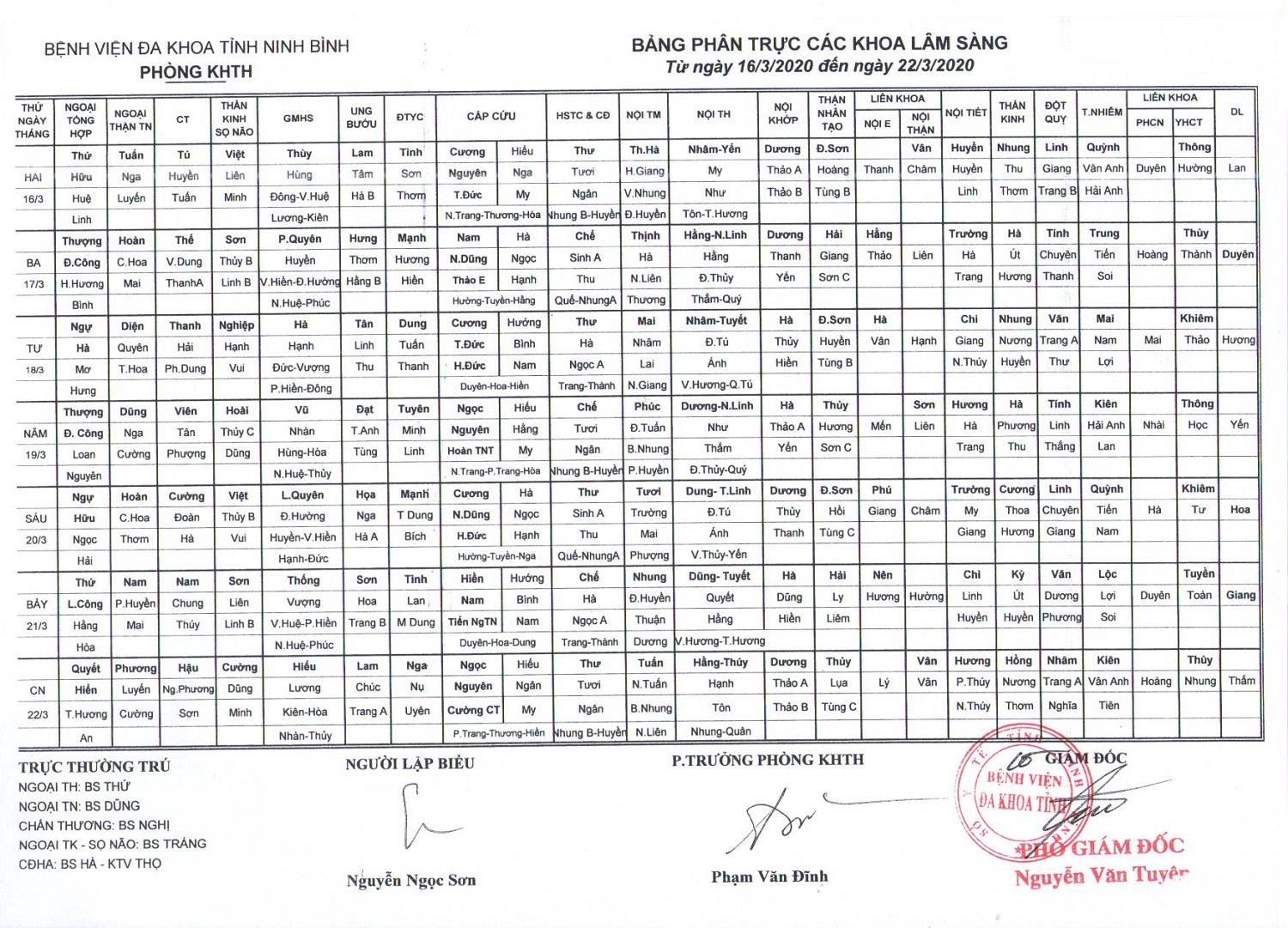 Bảng phân trực các khoa Lâm sàng (từ ngày 16 đến ngày 22 tháng 3 năm 2020)