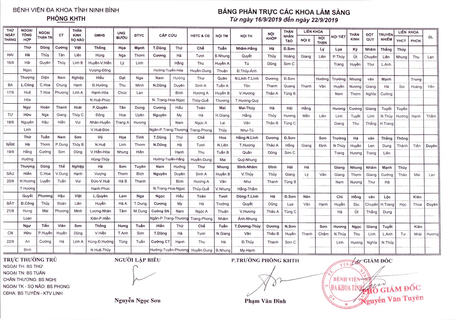 Bảng phân trực các khoa Lâm sàng (từ ngày 16 đến ngày 22 tháng 9 năm 2019)