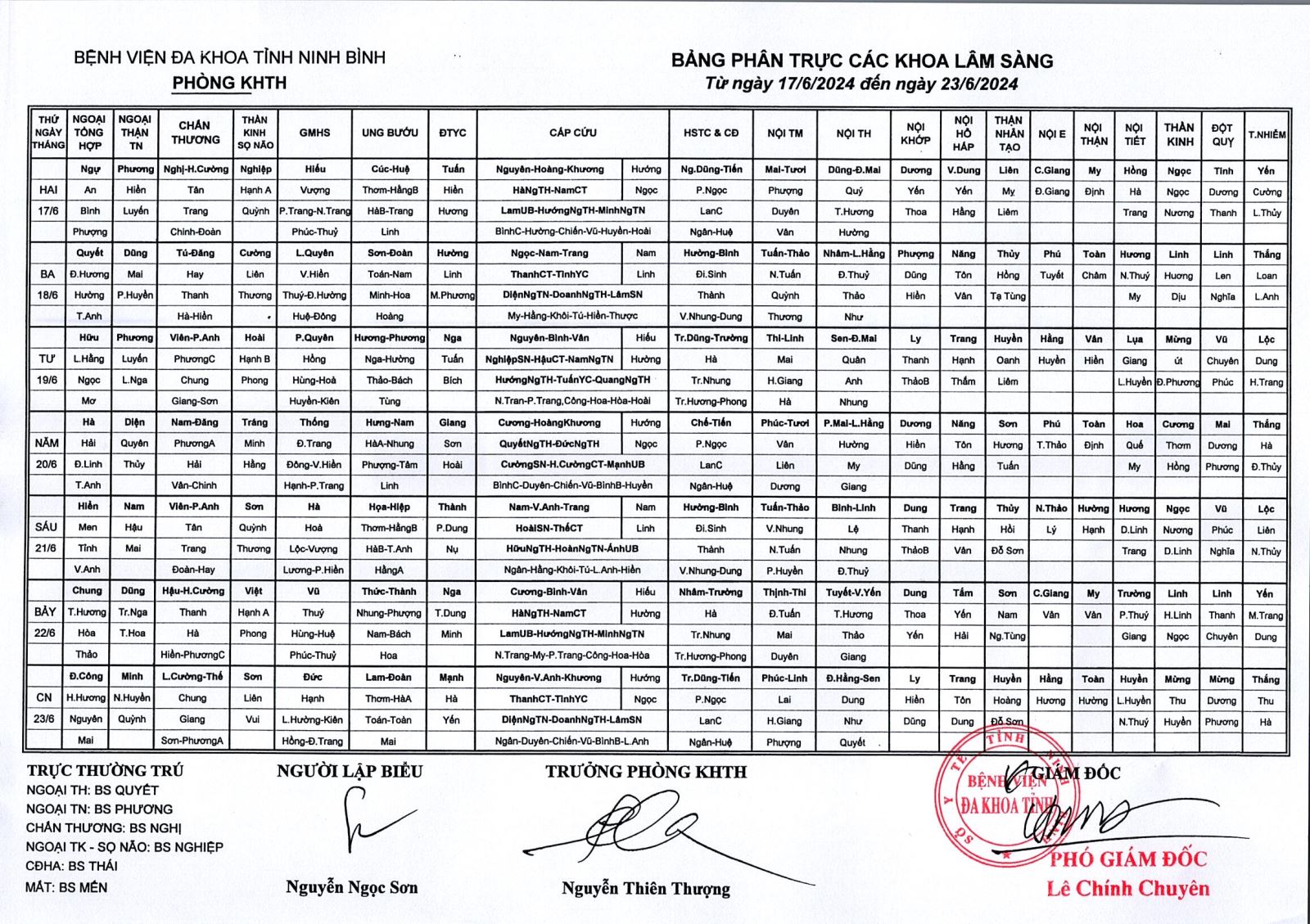 Bảng phân trực các khoa Lâm sàng (từ ngày 17 đến ngày 23 tháng 6 năm 2024).