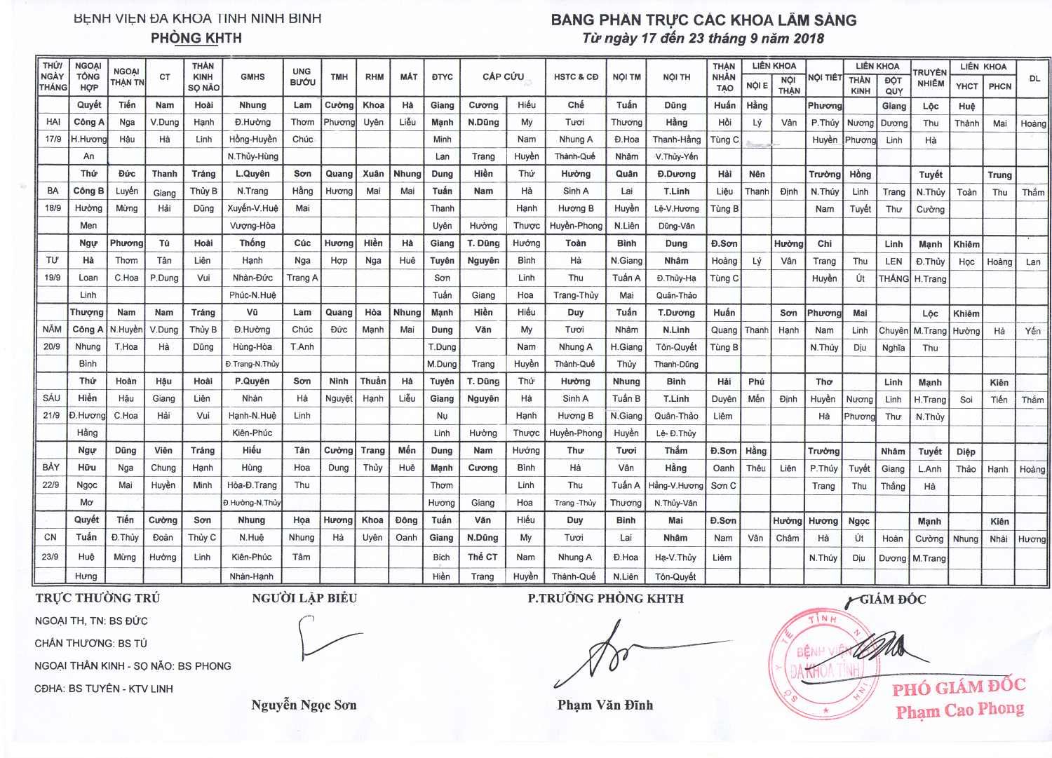 Bảng phân trực các khoa Lâm sàng (từ ngày 17 đến ngày 23 tháng 9 năm 2018)