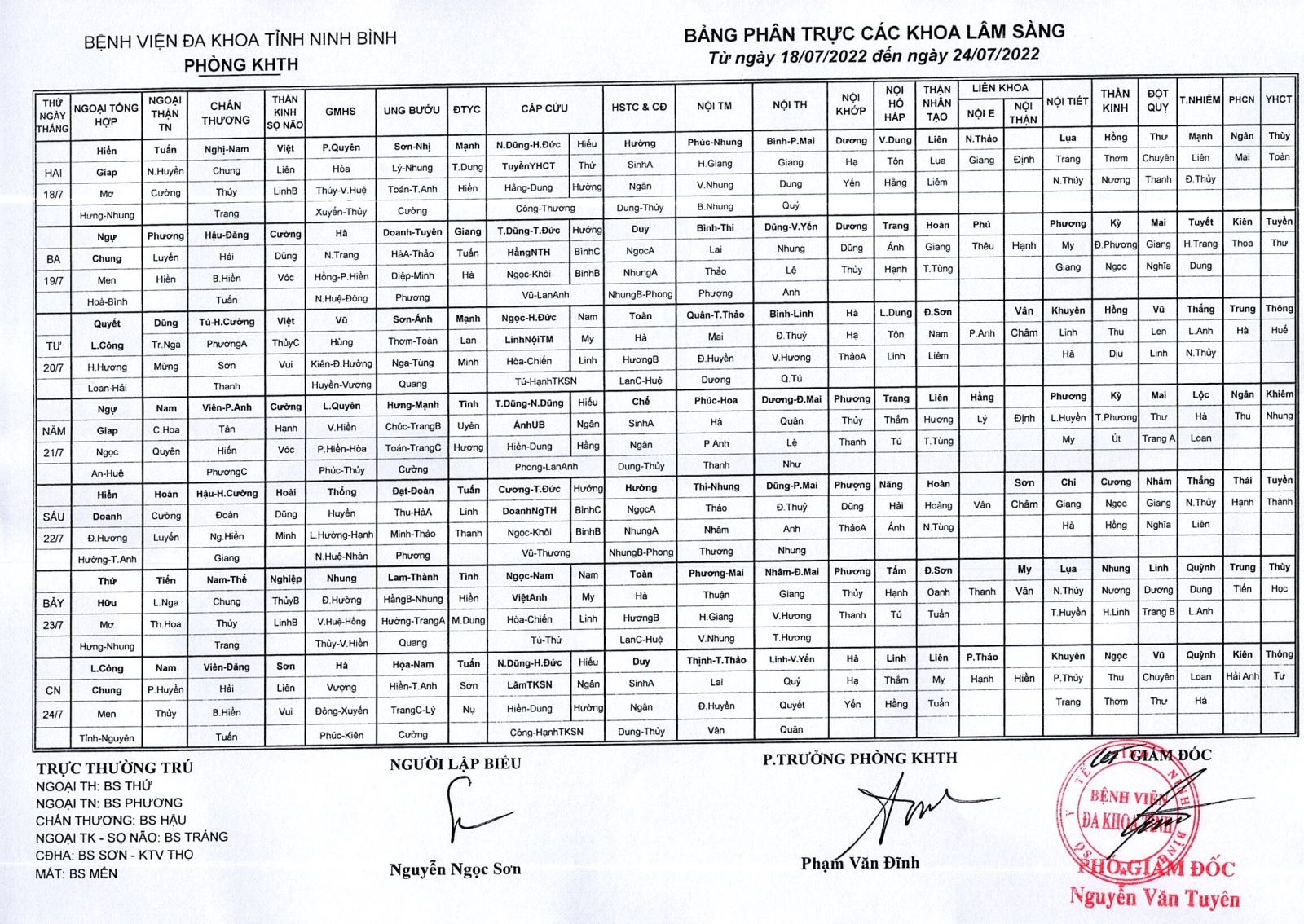 Bảng phân trực các khoa Lâm sàng (từ ngày 18 đến 24 tháng 7 năm 2022).