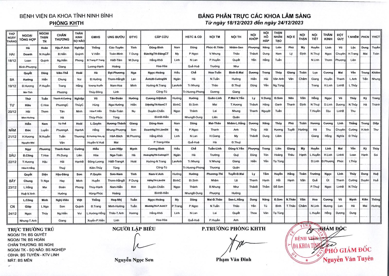 Bảng phân trực các khoa Lâm sàng (từ ngày 18 đến ngày 24 tháng 12 năm 2023).
