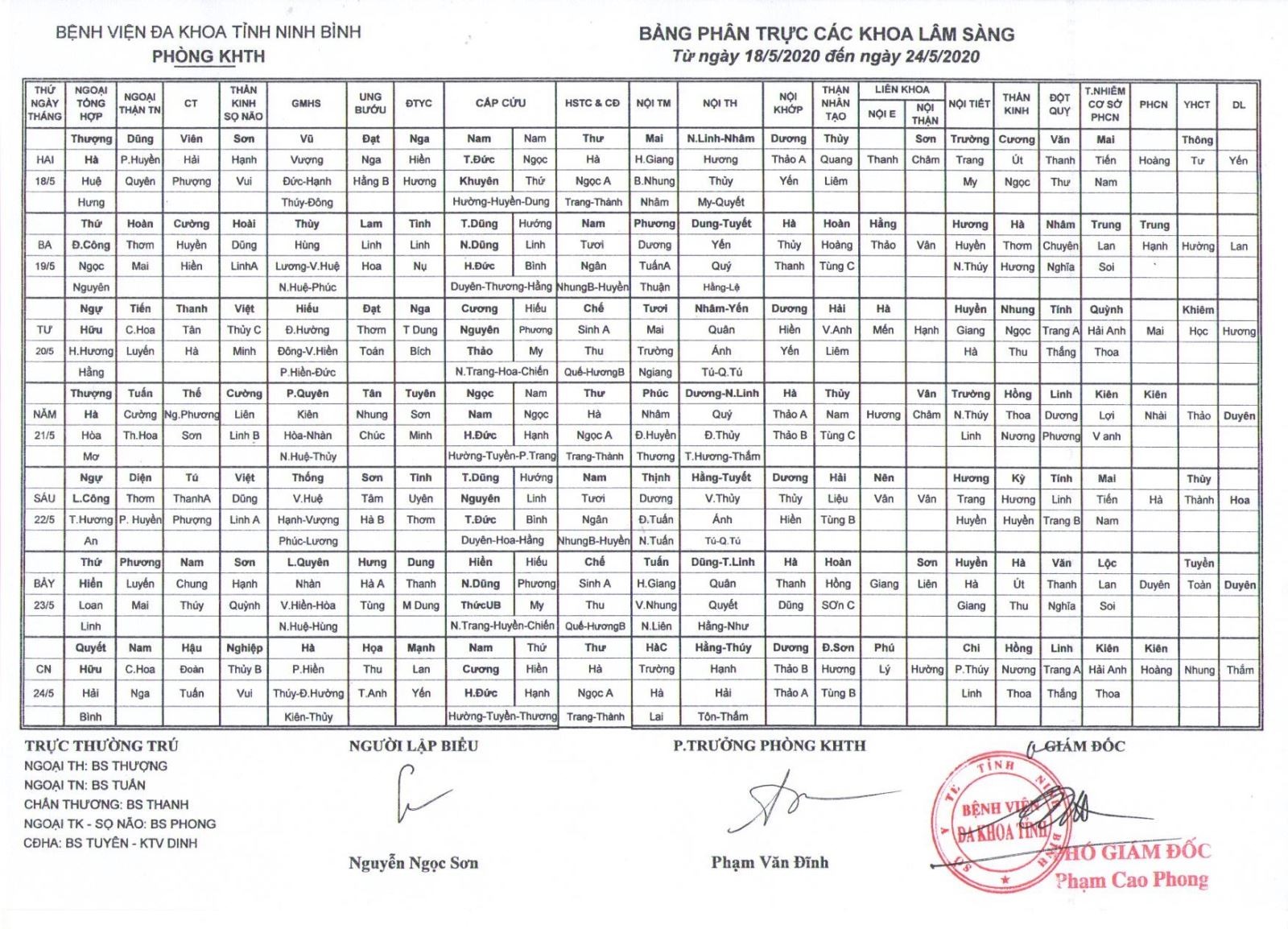 Bảng phân trực các khoa Lâm sàng (từ ngày 18 đến ngày 24 tháng 5 năm 2020)