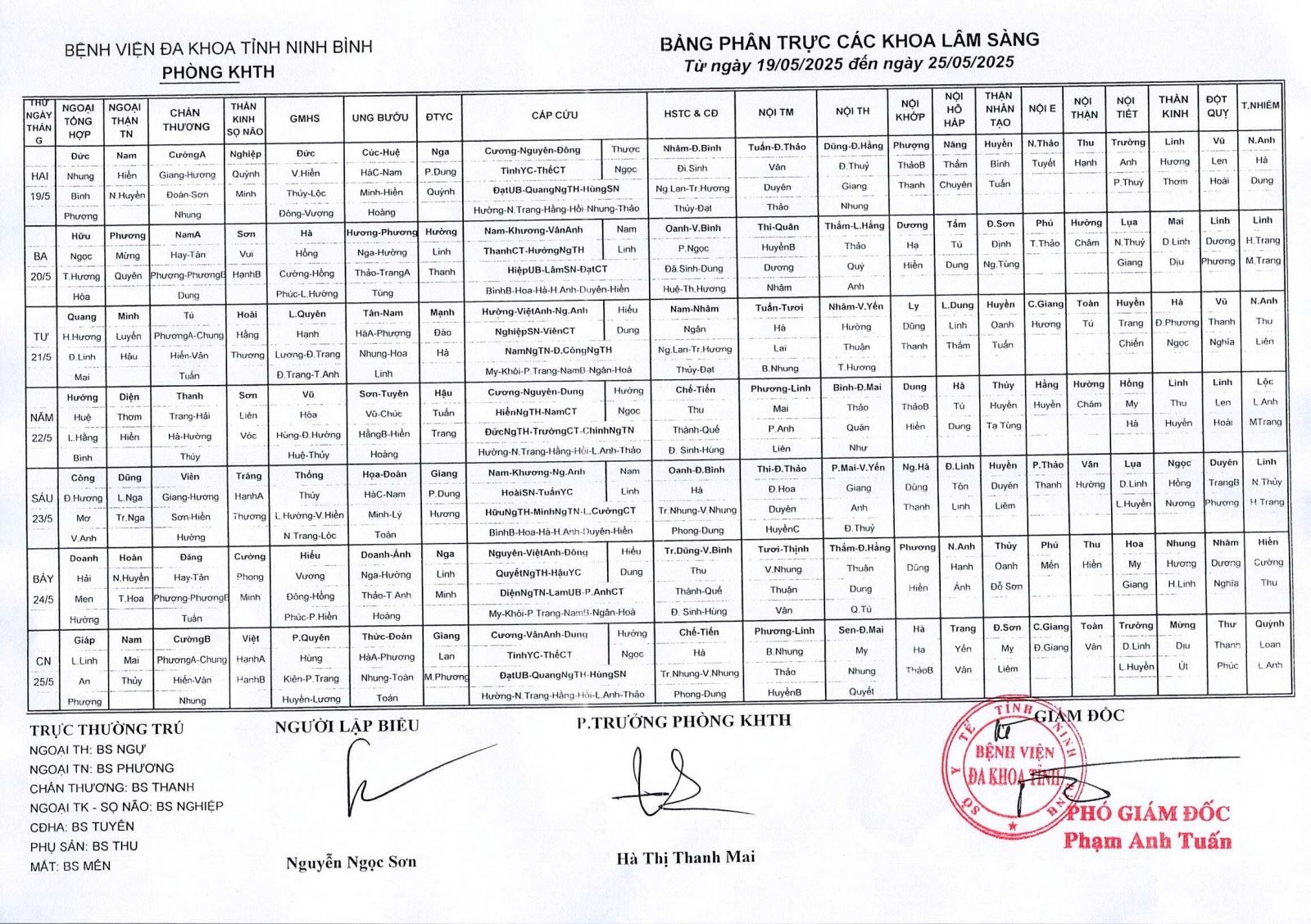 Bảng phân trực các khoa Lâm sàng (từ ngày 19 đến ngày 25 tháng 5 năm 2025).