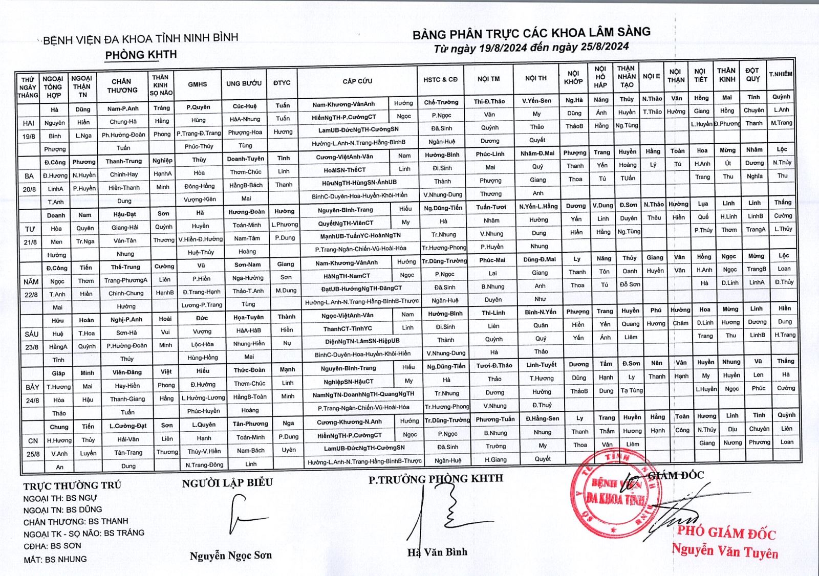 Bảng phân trực các khoa Lâm sàng (từ ngày 19 đến ngày 25 tháng 8 năm 2024).