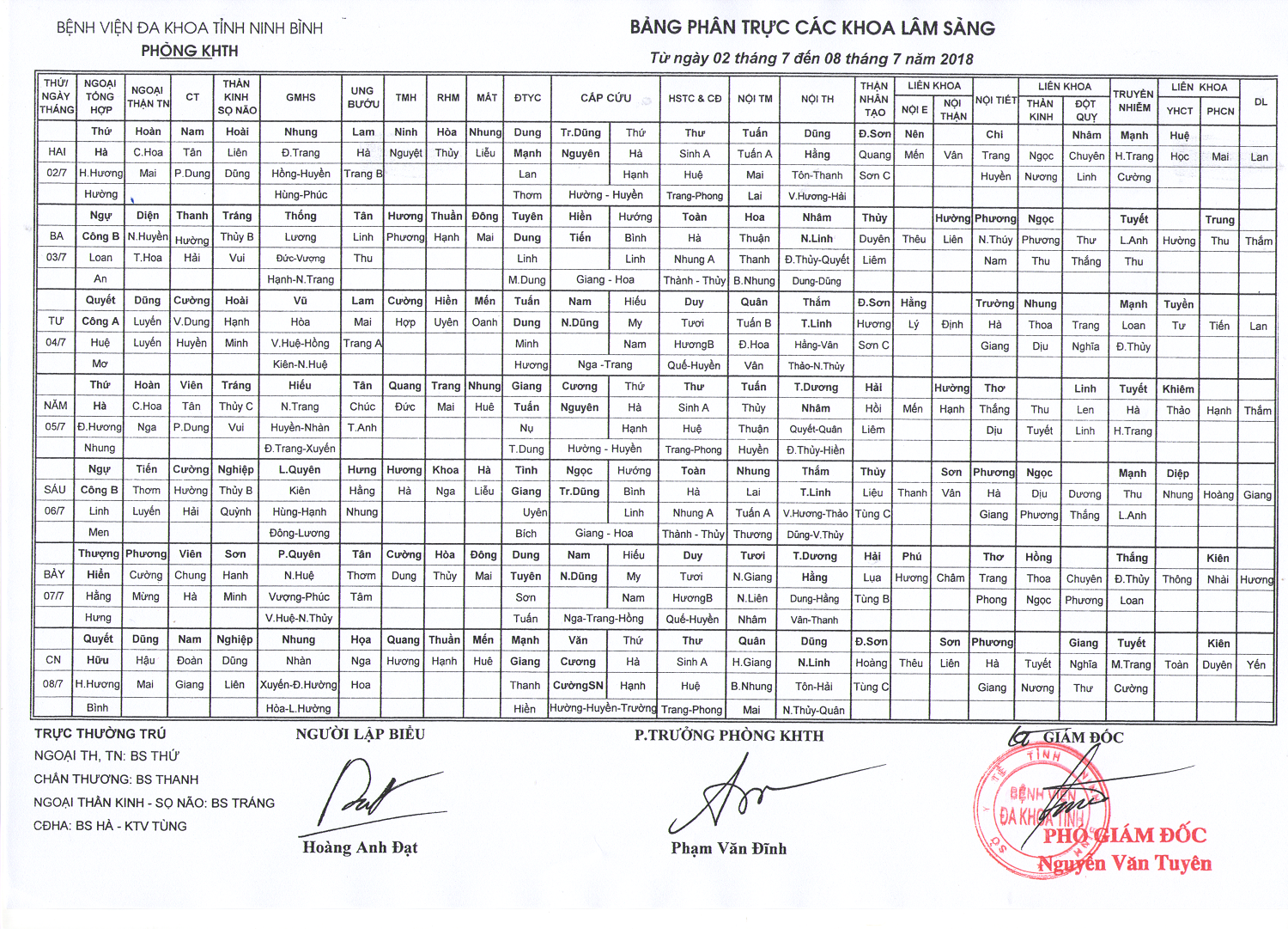 Bảng phân trực các khoa Lâm sàng (từ ngày 2 đến ngày 8 tháng 7 năm 2018)
