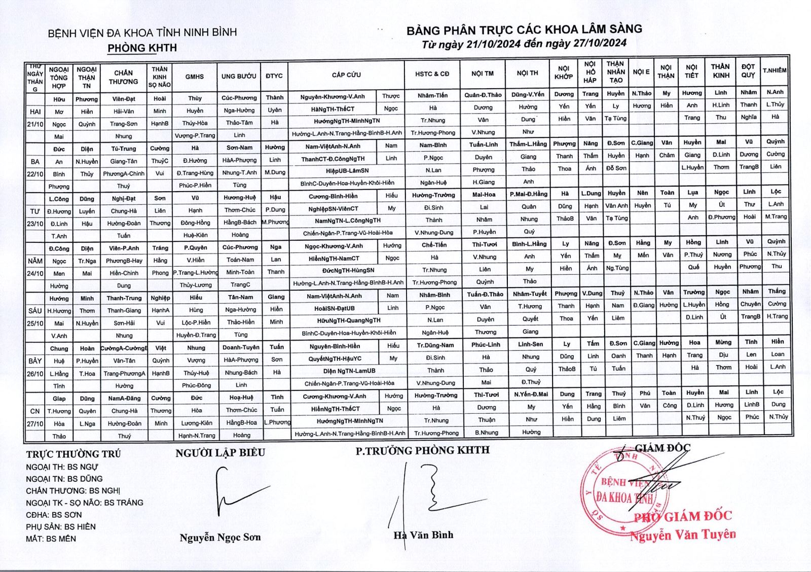 Bảng phân trực các khoa Lâm sàng (từ ngày 21 đến ngày 27 tháng 10 năm 2024).