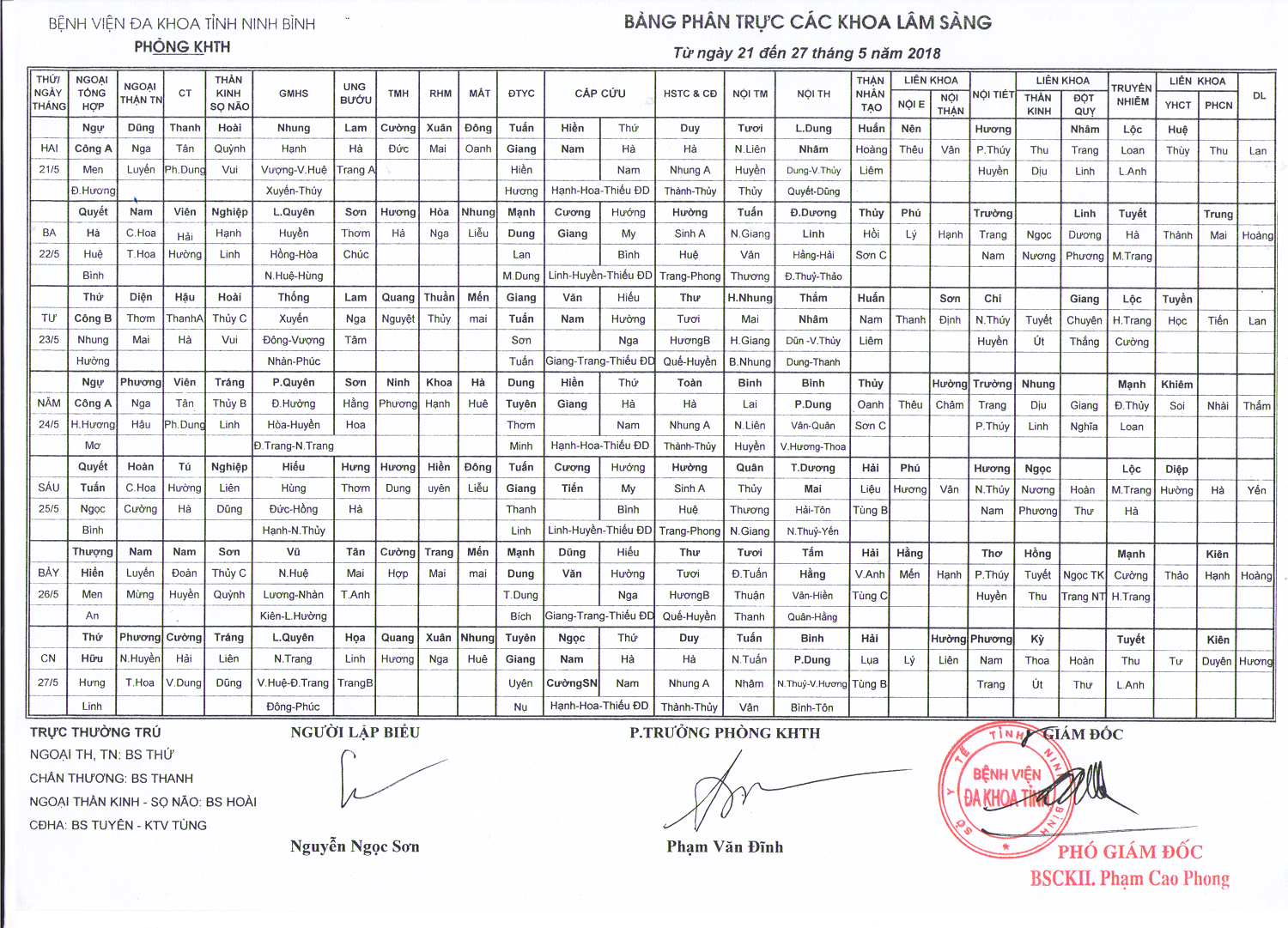 Bảng phân trực các khoa Lâm sàng (từ ngày 21 đến ngày 27 tháng 5 năm 2018)