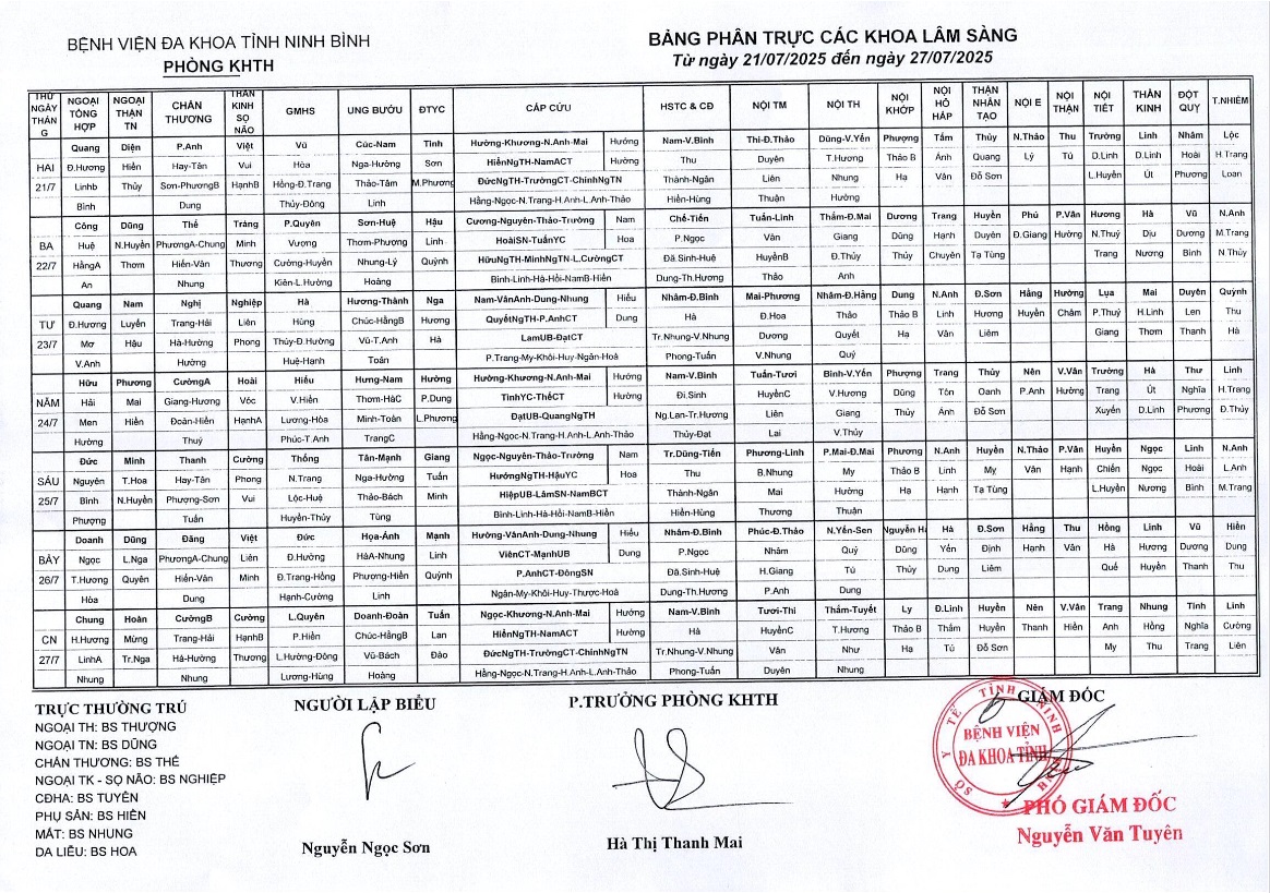 Bảng phân trực các khoa Lâm sàng (từ ngày 21 đến ngày 27 tháng 7 năm 2025).