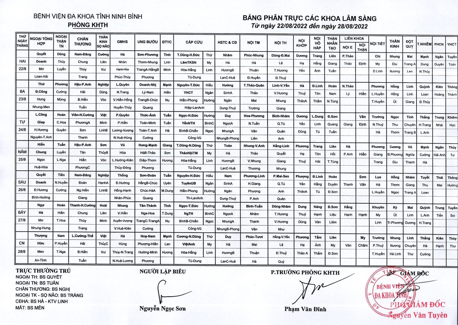 Bảng phân trực các khoa Lâm sàng (từ ngày 22 đến ngày 28 tháng 8 năm 2022).