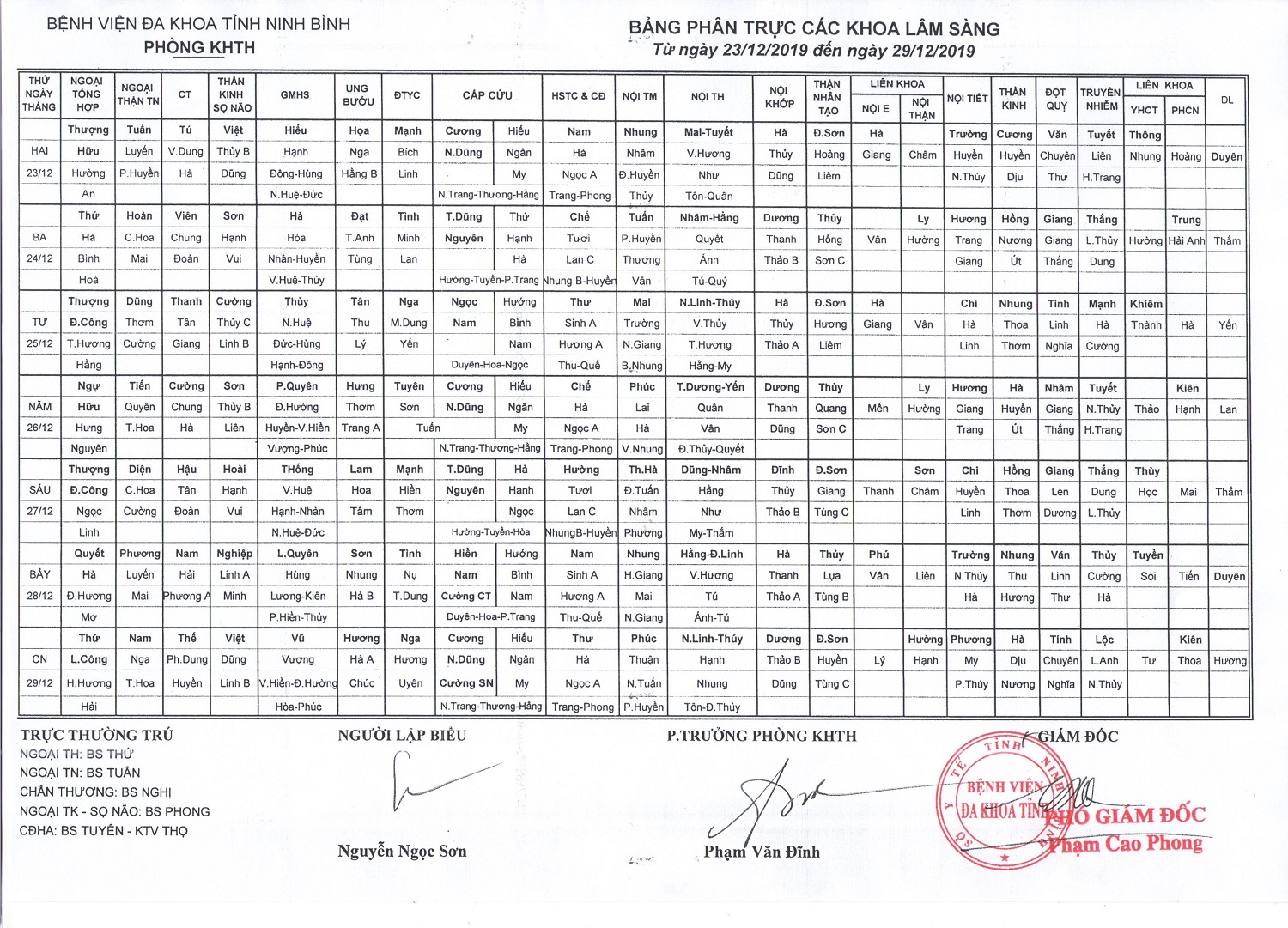 Bảng phân trực các khoa Lâm sàng (từ ngày 23 đến ngày 29 tháng 12 năm 2019)