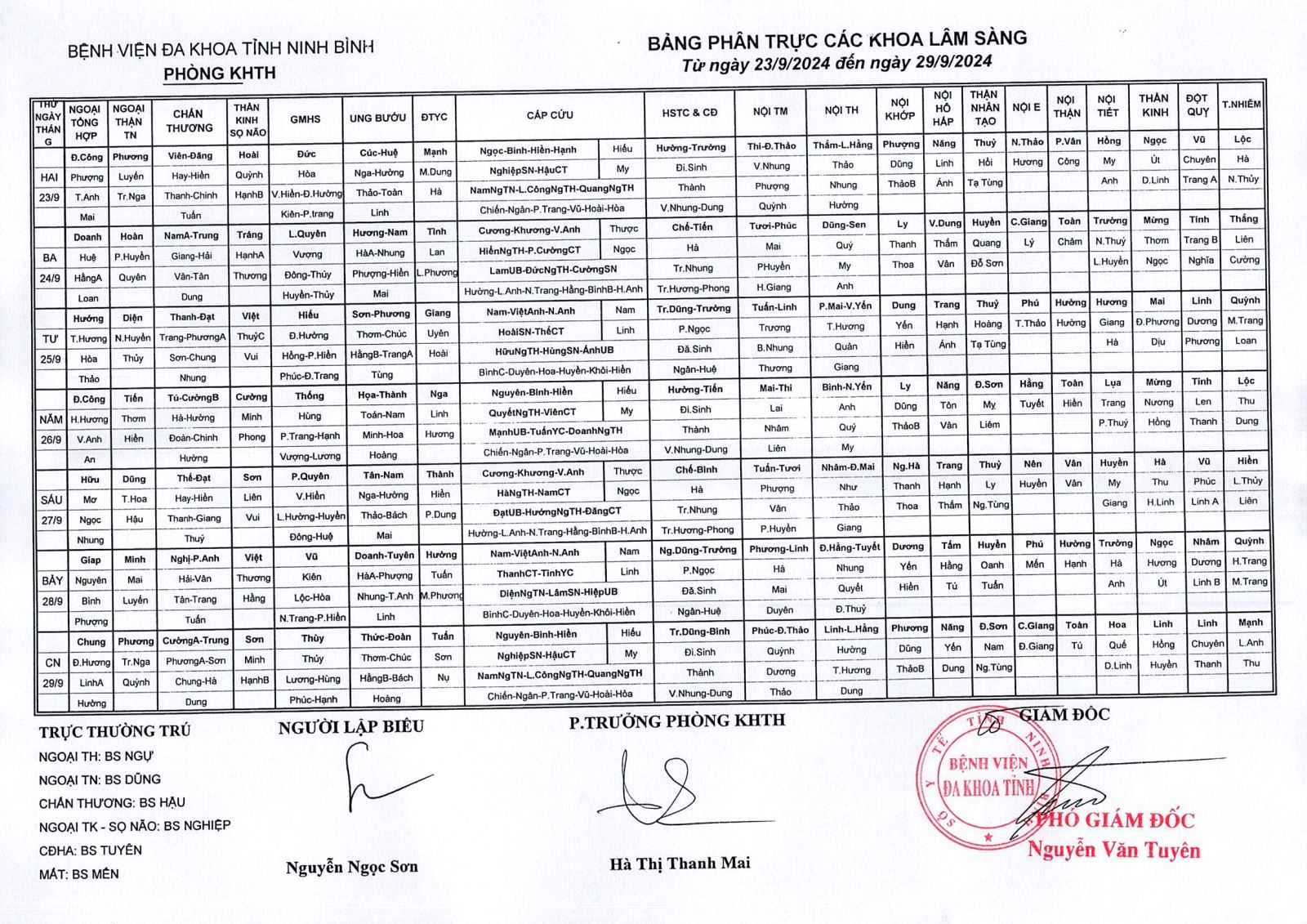 Bảng phân trực các khoa Lâm sàng (từ ngày 23 đến ngày 29 tháng 9 năm 2024).