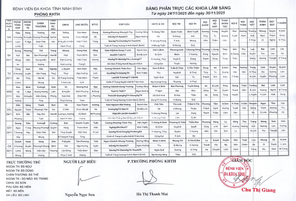 Bảng phân trực các khoa Lâm sàng (từ ngày 24 đến ngày 30 tháng 11 năm 2025).