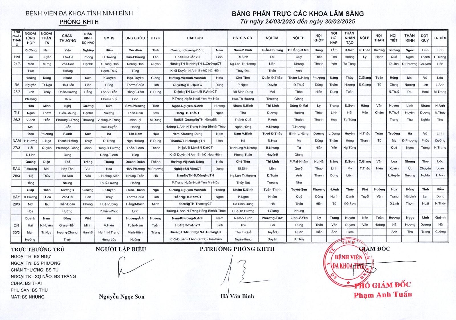 Bảng phân trực các khoa Lâm sàng (từ ngày 24 đến ngày 30 tháng 3 năm 2025).