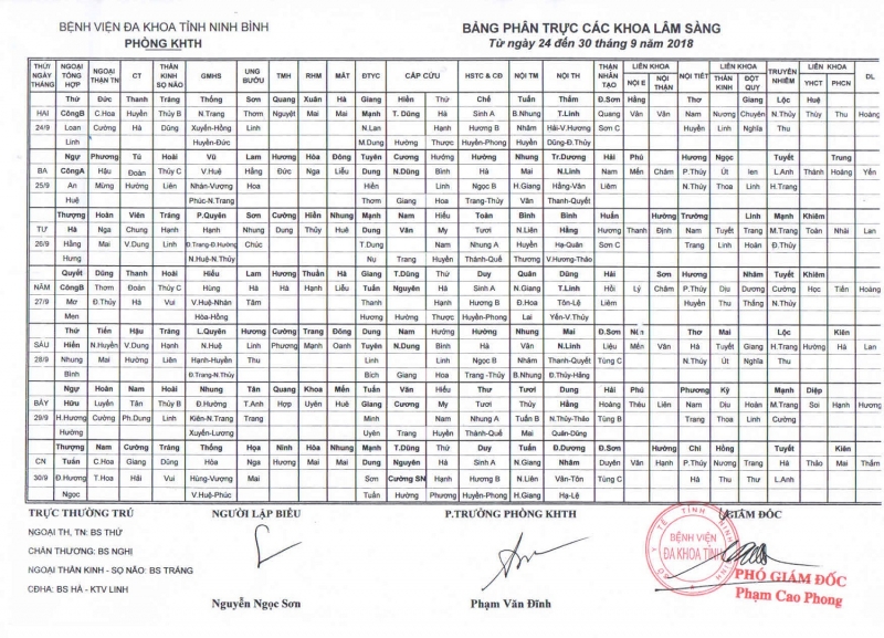 Bảng phân trực các khoa Lâm sàng (từ ngày 24 đến ngày 30 tháng 9 năm 2018)