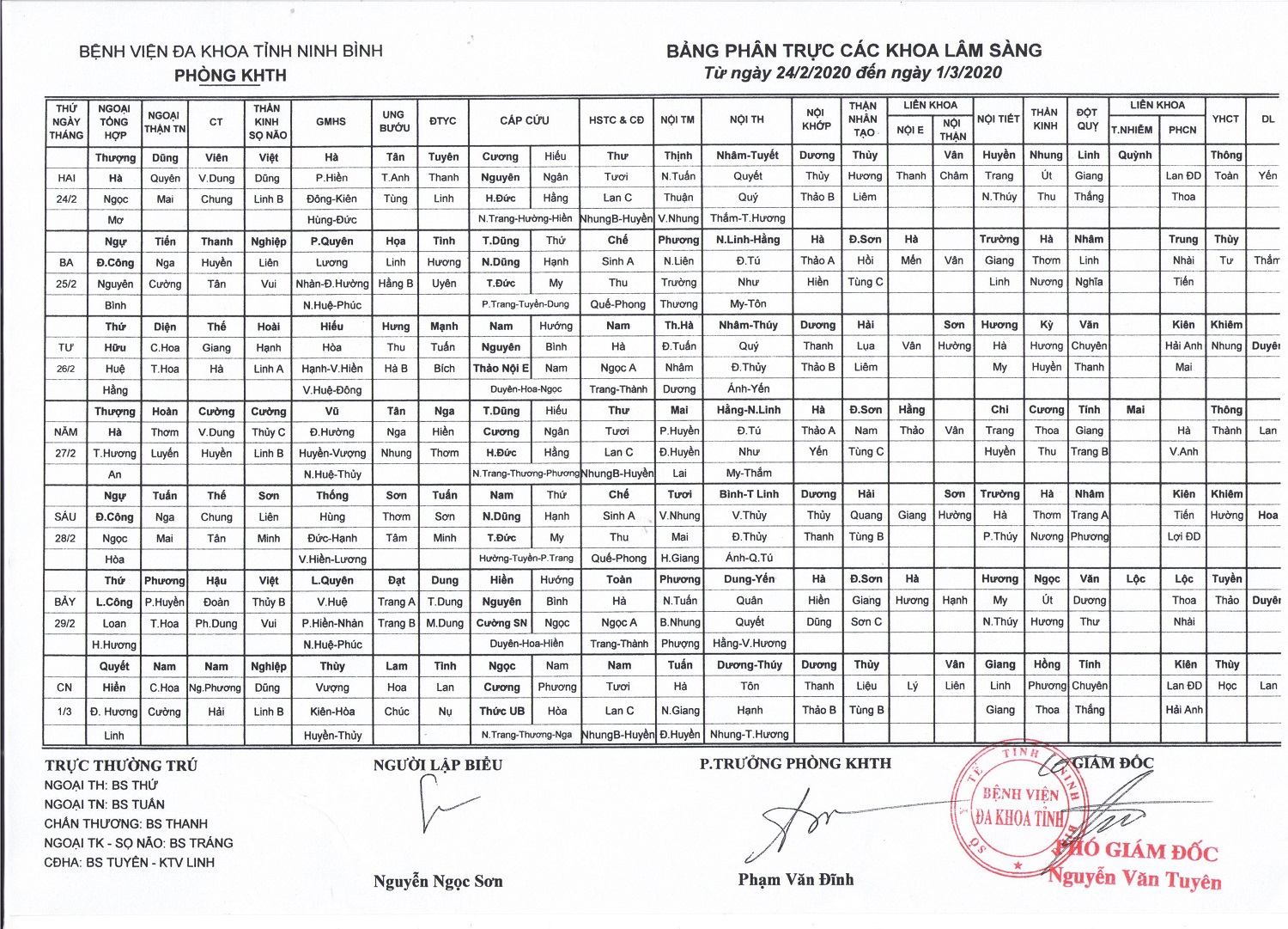 Bảng phân trực các khoa Lâm sàng (từ ngày 24 tháng 2 đến ngày 1 tháng 3 năm 2020)