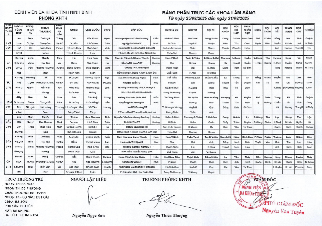 Bảng phân trực các khoa Lâm sàng (từ ngày 25 đến ngày 31 tháng 8 năm 2025)