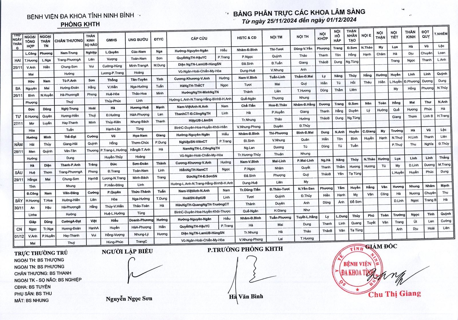 Bảng phân trực các khoa Lâm sàng (từ ngày 25 tháng 11 đến ngày 1 tháng 12 năm 2024)