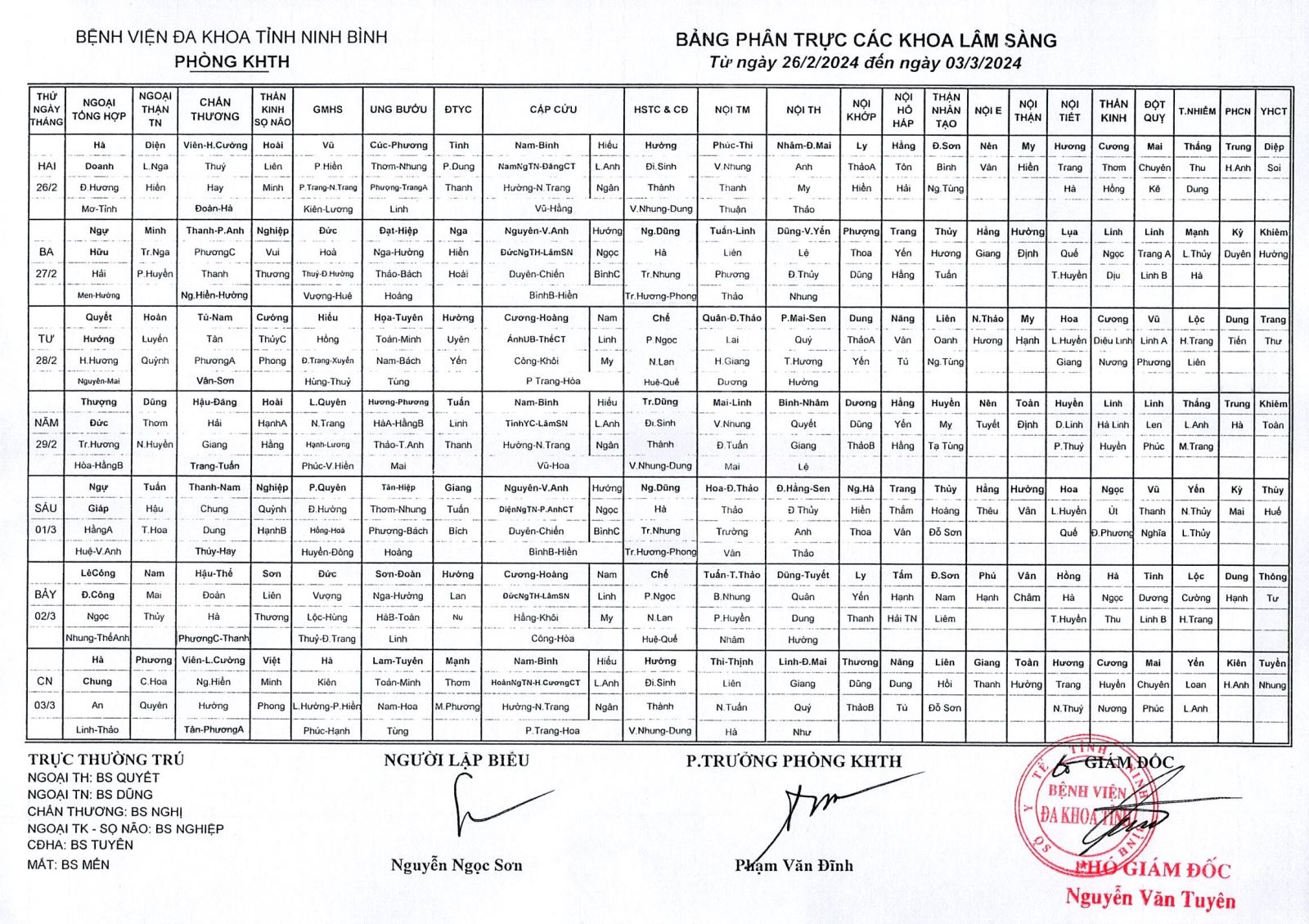 Bảng phân trực các khoa Lâm sàng (từ ngày 26 tháng 2 đến ngày 3 tháng 3 năm 2024).