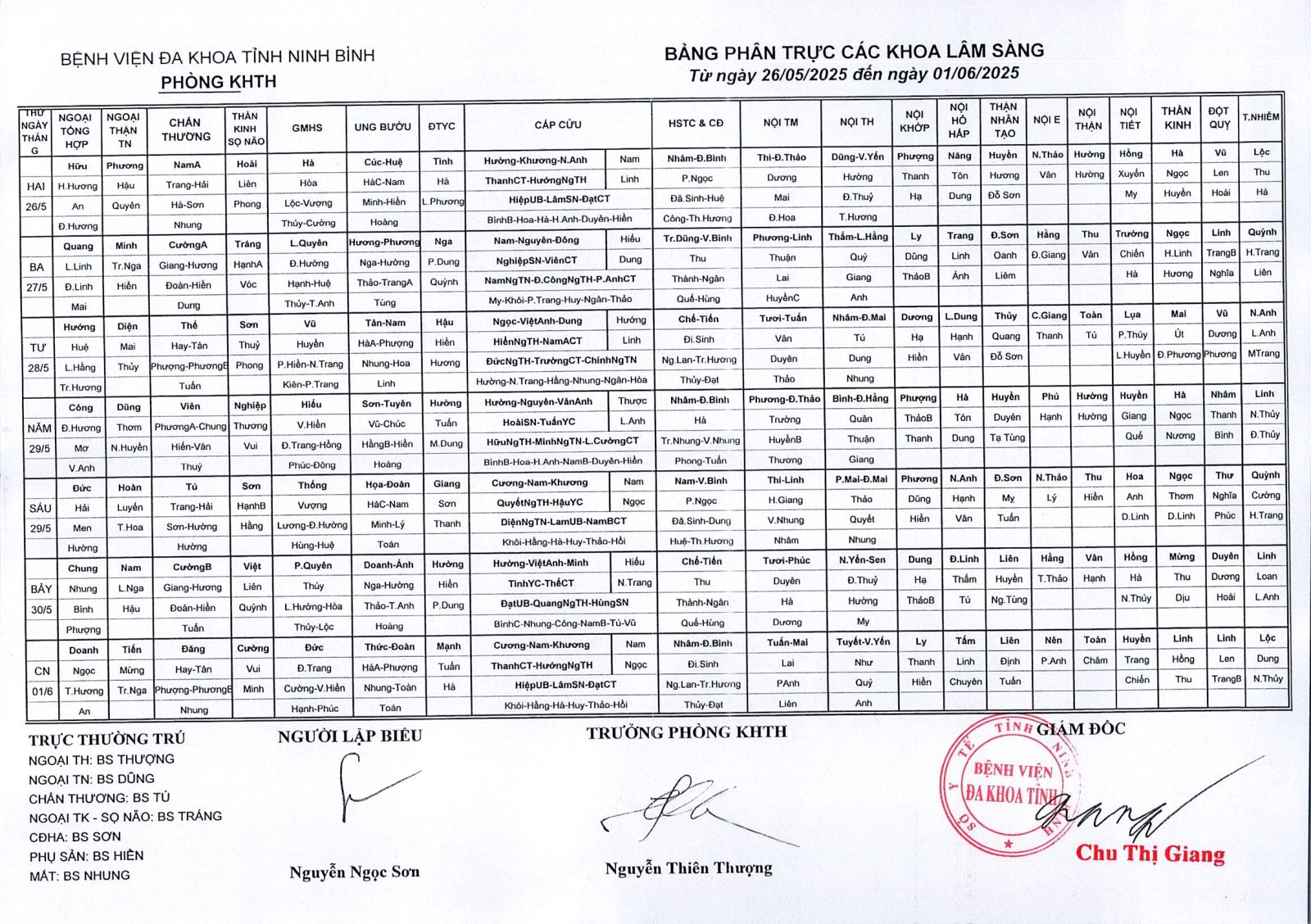 Bảng phân trực các khoa Lâm sàng (từ ngày 26 tháng 5 đến ngày 1 tháng 6 năm 2025).