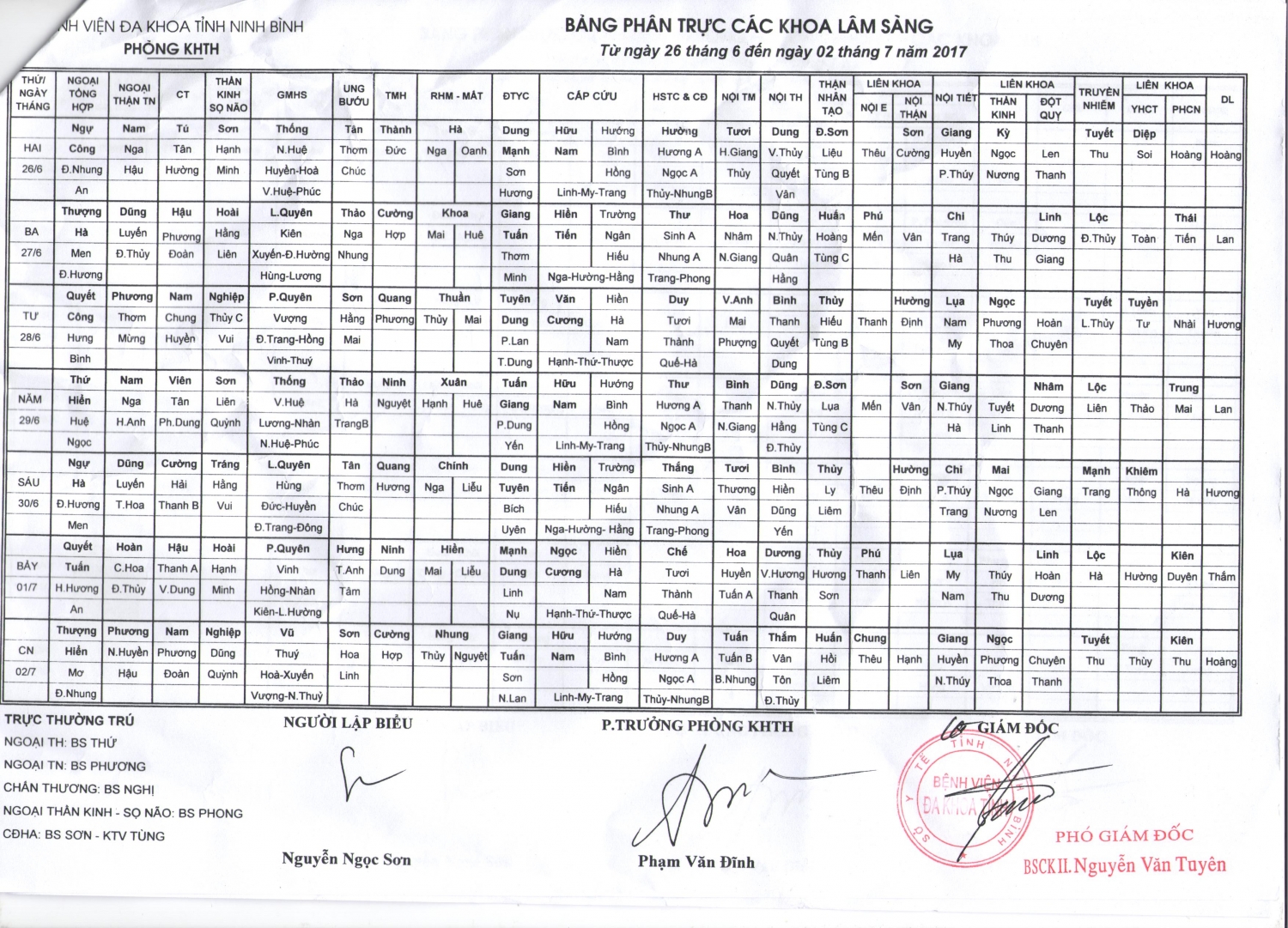 Bảng phân trực các khoa Lâm sàng (từ ngày 26 tháng 6 đến ngày 2 tháng 7 năm 2017)