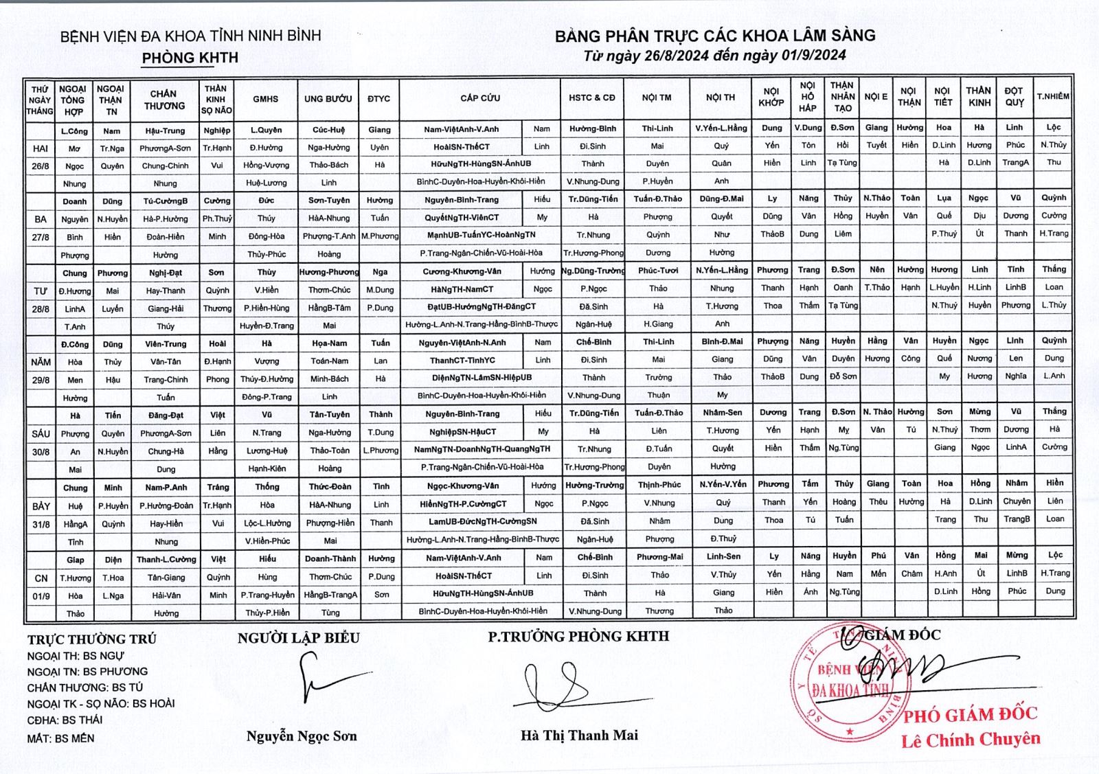 Bảng phân trực các khoa Lâm sàng (từ ngày 26 tháng 8 đến ngày 1 tháng 9 năm 2024).