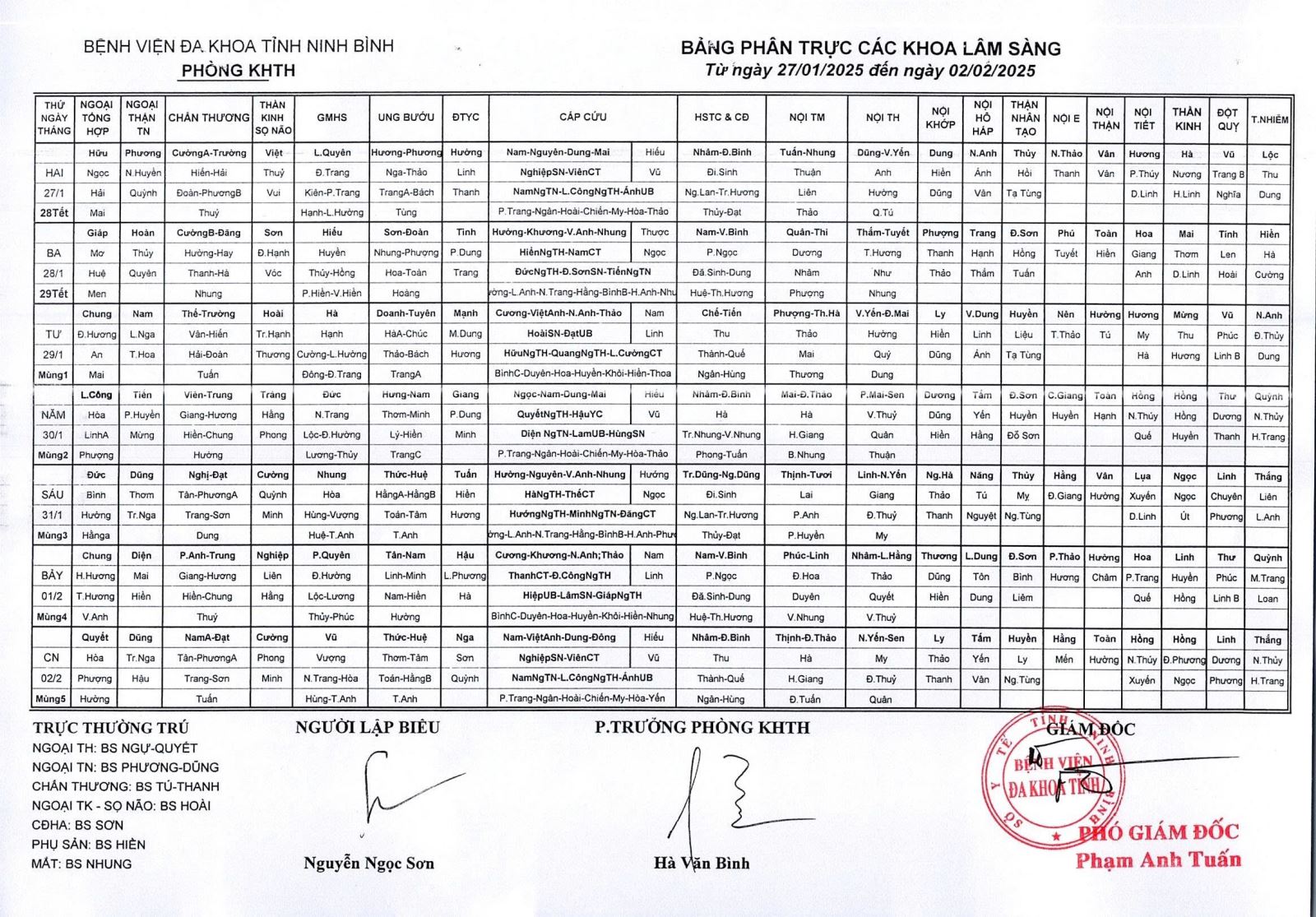 Bảng phân trực các khoa Lâm sàng (từ ngày 27 tháng 1 đến 2 tháng 2 năm 2025).